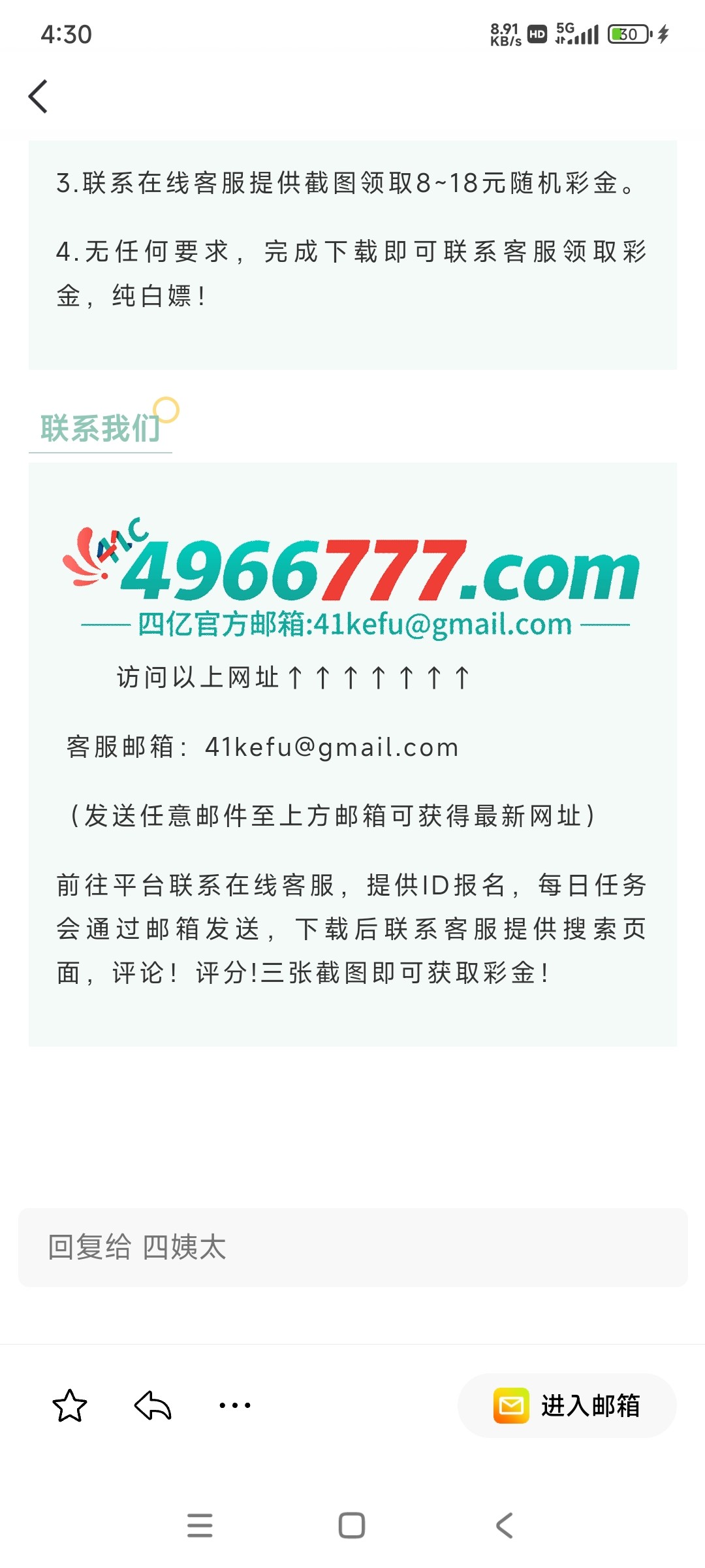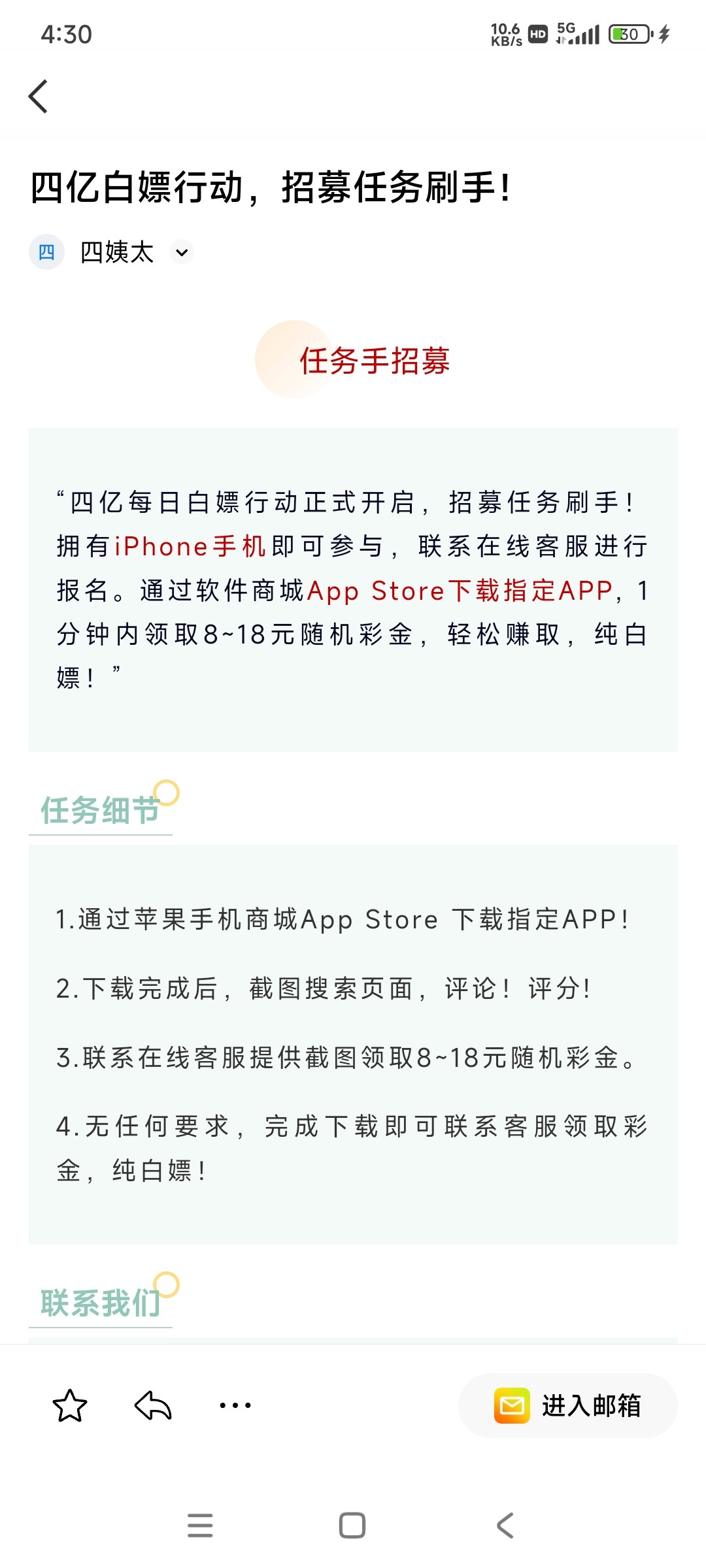 QQ邮箱看到的,有苹果手机可以去联系客服做任务领彩金,4966555.com