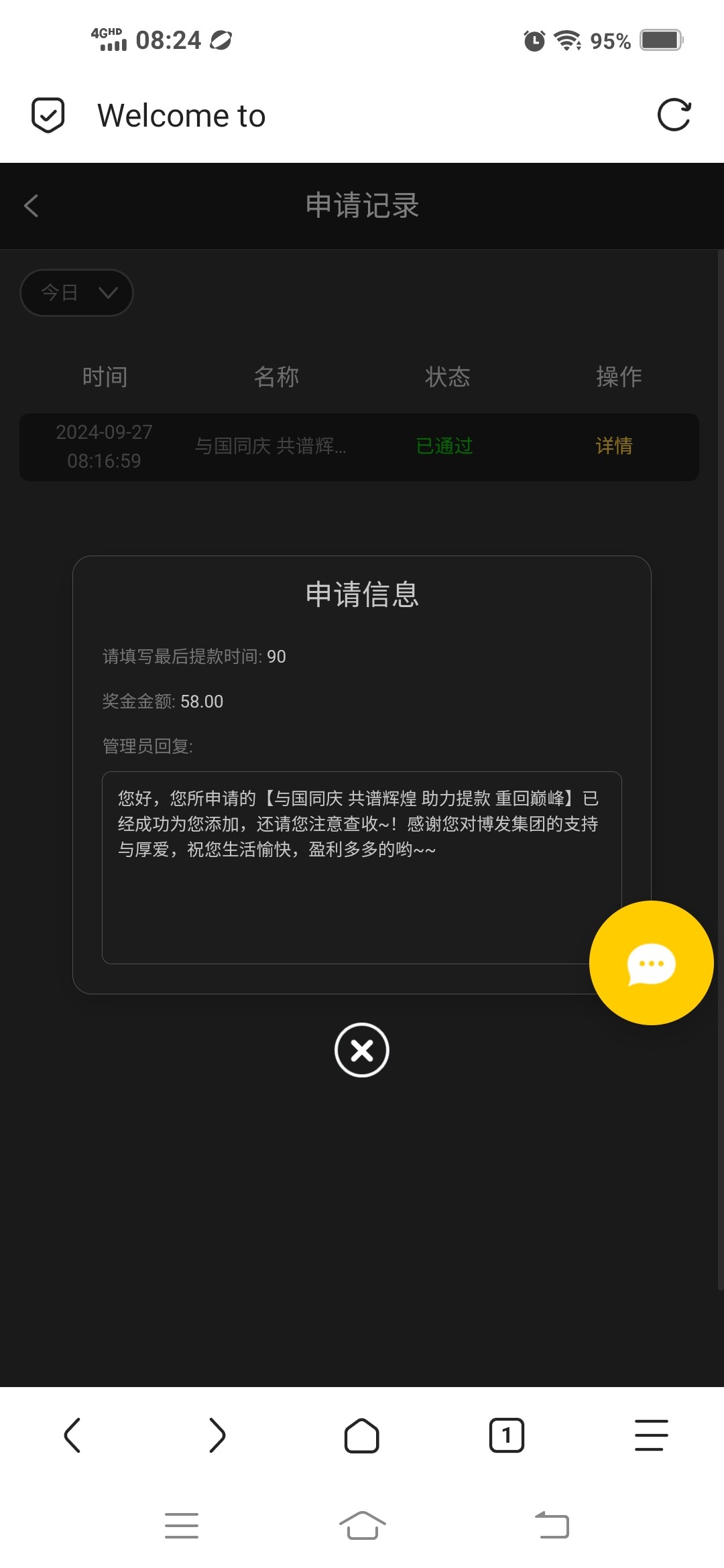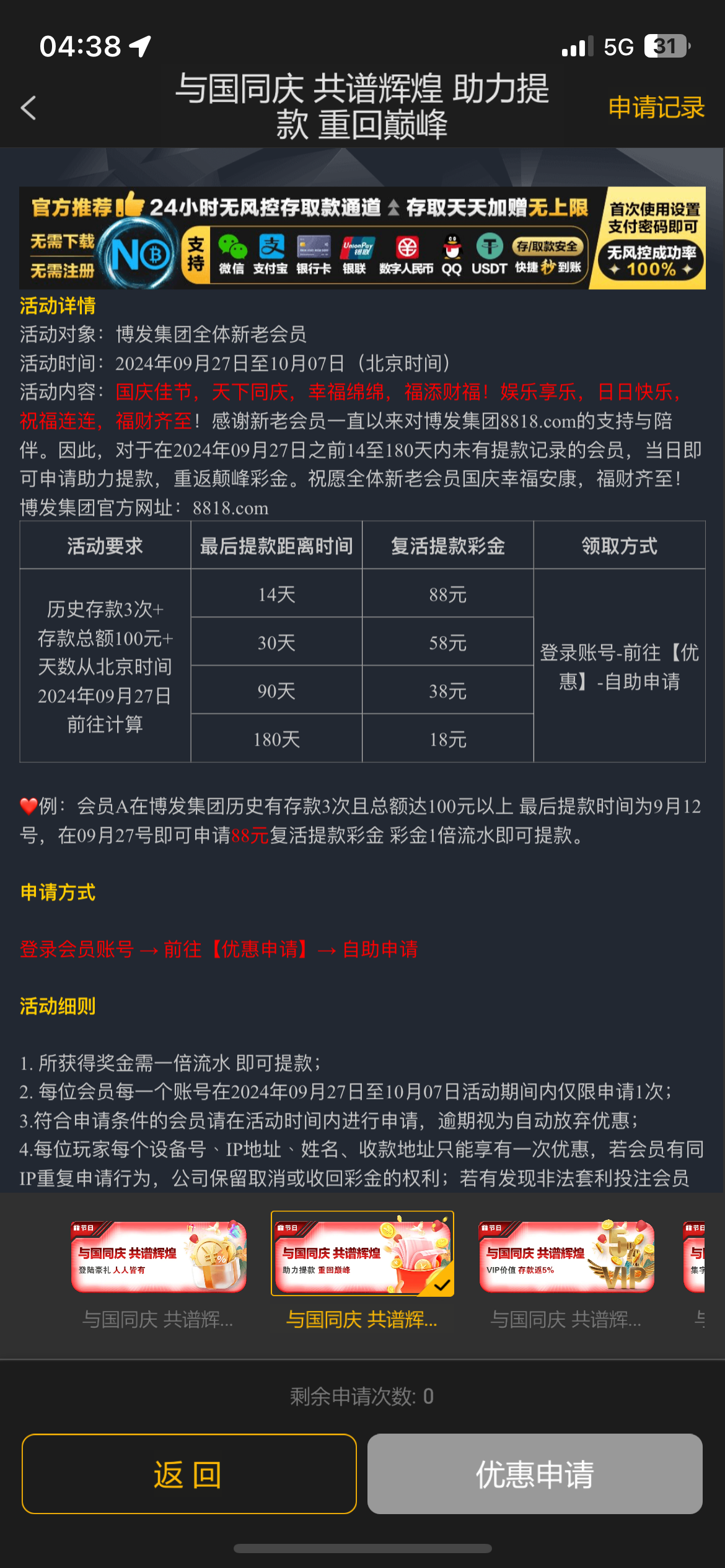 您好,所申请的【与国同庆 共谱辉煌 助力提款 重回巅峰】需要会员于2024年9月27日之前14至180天内无提款记录才符合优惠条件哦。由于您已超过180天未产生取款记录,我们无法为您发送彩金。详情请点击查看优惠活动哦,带来不便请您谅解!~~
