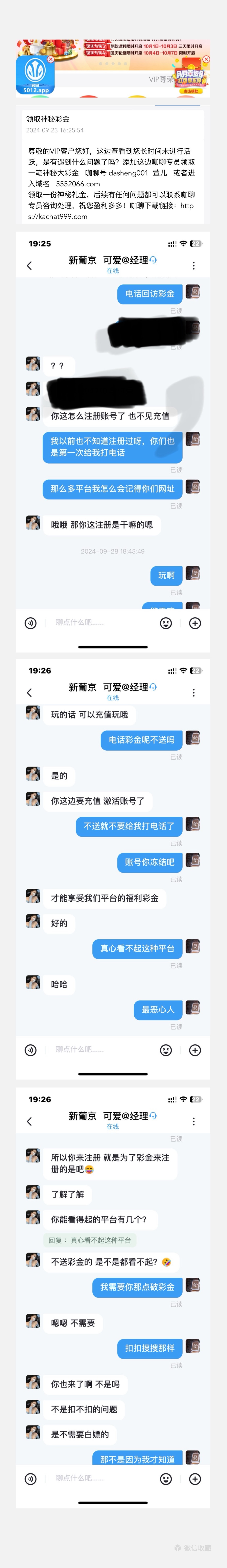 今天是真的有被恶心到了,今天电话回访说送彩金找客服加了司马专员,给我说不充值不送还问我为什么注册不充值,站内信彩金也不送说过期的,一台子都是些司马东西,打电话说充值送我都不说什么,进去就问为什么不充值恶心到我了少玩吧别充值了,真心看不起这种二百五一样的平台,充一分钱我都对不起它祖宗十八代,老哥们往死里白嫖它,给它干倒闭!