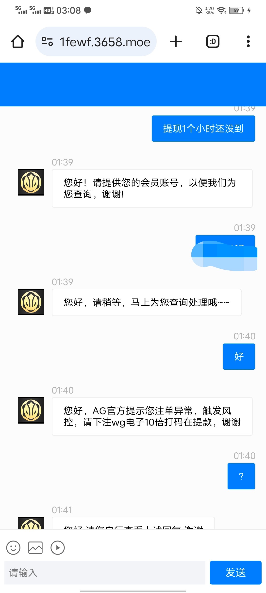刚才在2616新葡京提0.8个,平时几分钟到十几分钟就能到,这次等了一个小时还没到,然后我就去找客服,客服给的解释是ag提示注单异常,然后要求我去一个垃圾电子打8万流水,我就去打了一个多小时打出来了,最高打到1.7个,我不敢打太多,最后打剩6000多,还真给提了。这个星期一共提了6个多,赢了3个多左右,都是打的ag。所以我想问大家ag提示注单异常这种事到底真的假的,还是狗庄玩不起了。