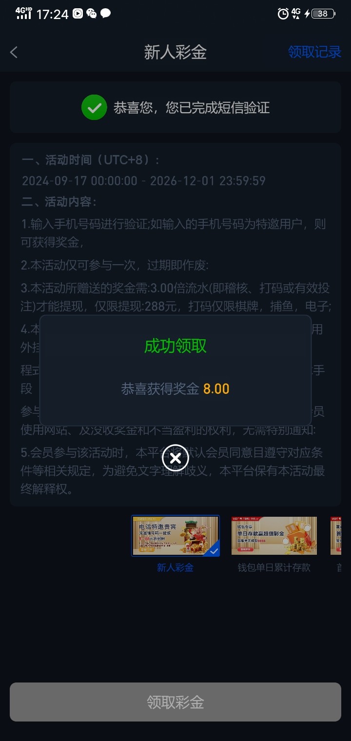 这个台子,收到短信了,但是注册了就是不给领这个彩金