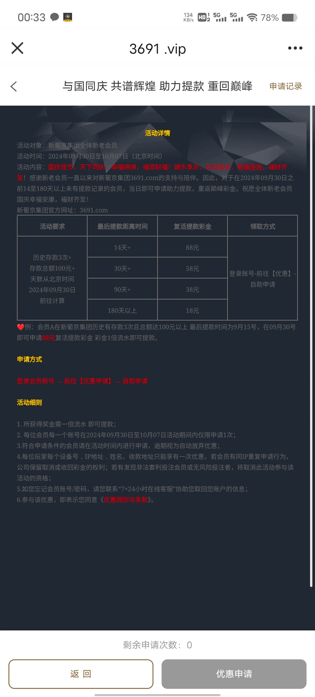 我的建议是把你充值过的台子APP都下载登录一下!因为那些活动要求小字你不注意看就会错过很多东西!