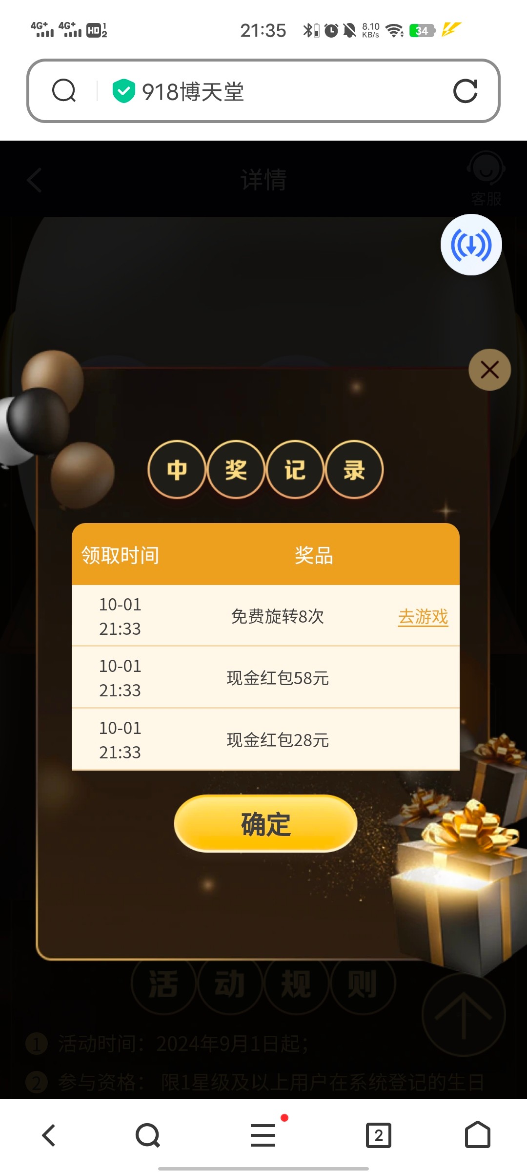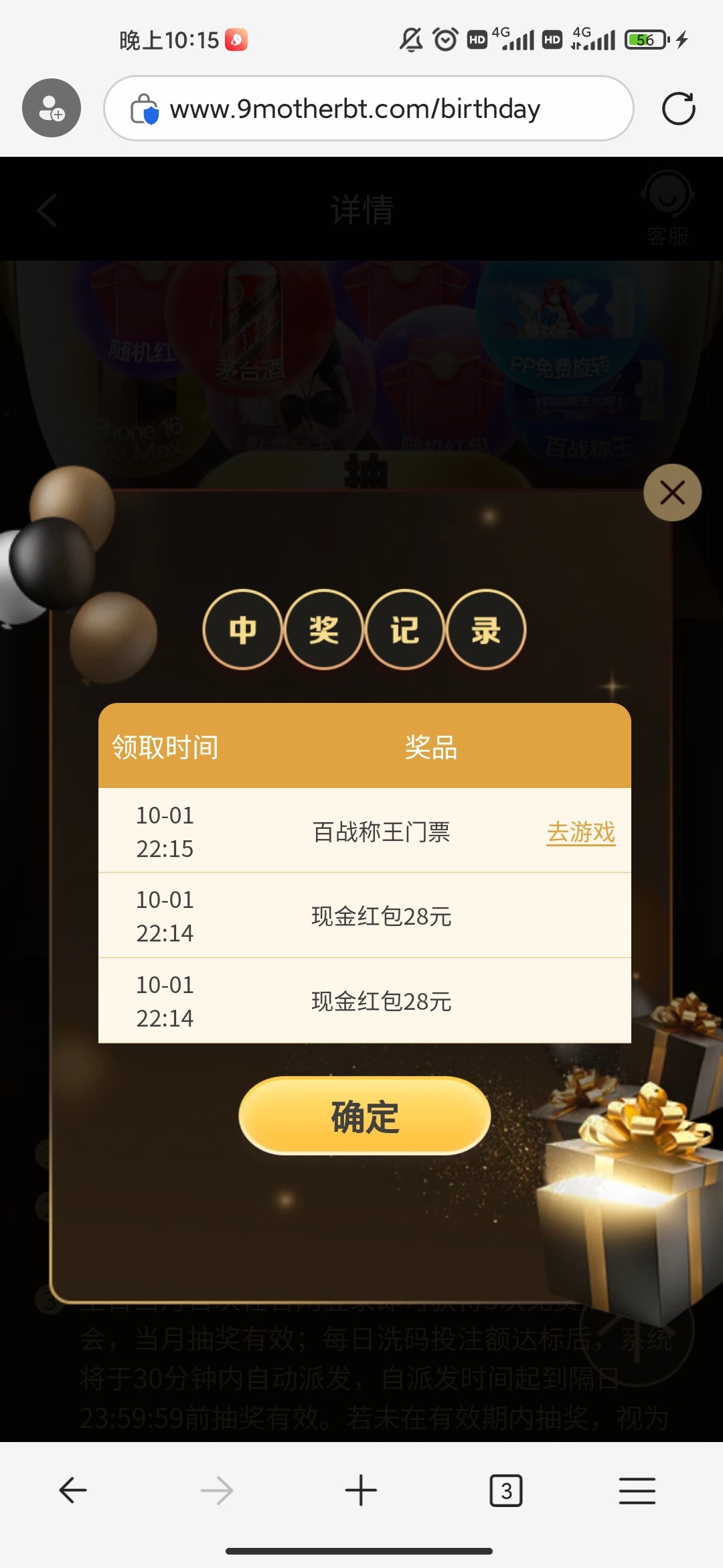 找到这个活动,把日期设置成当天的,然后重新登录,过几分钟就送你三次抽奖次数 官网:918.com