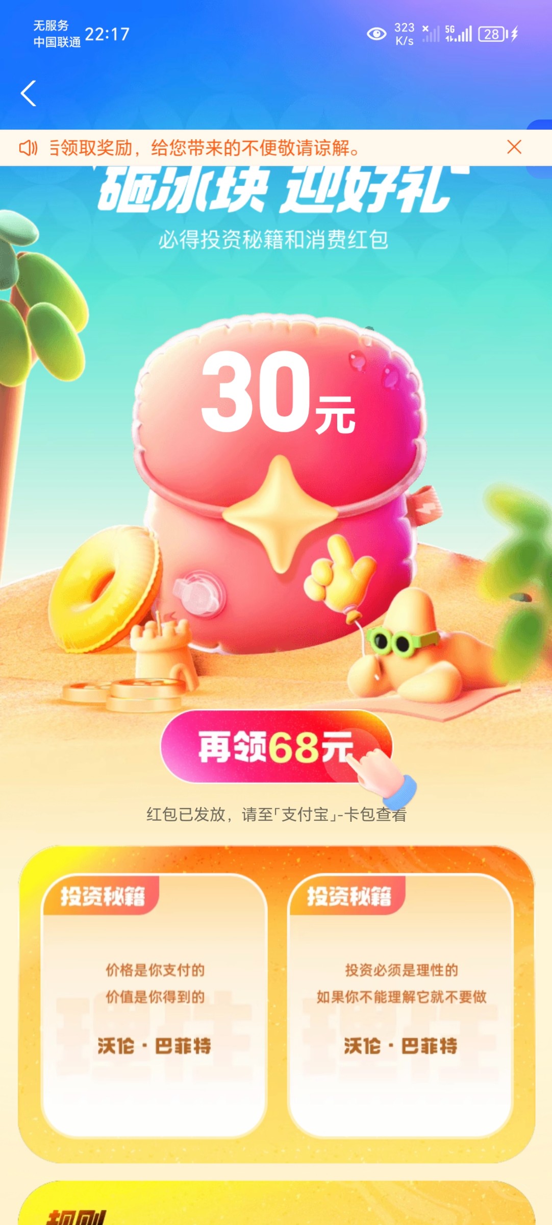 兄弟看下自己支付宝卡包里有没有财富宠粉节有的话进去砸冰块,我中了30最高50,挂壁的兄弟买包烟抽
