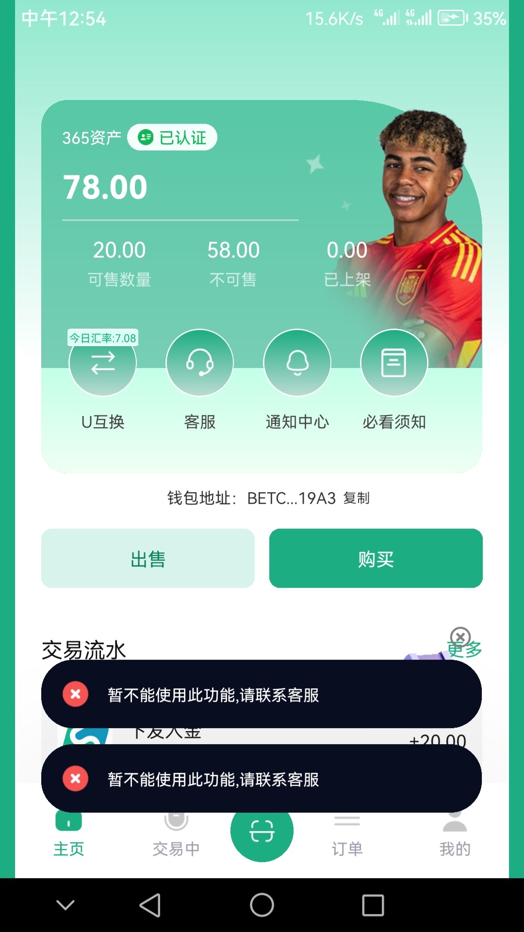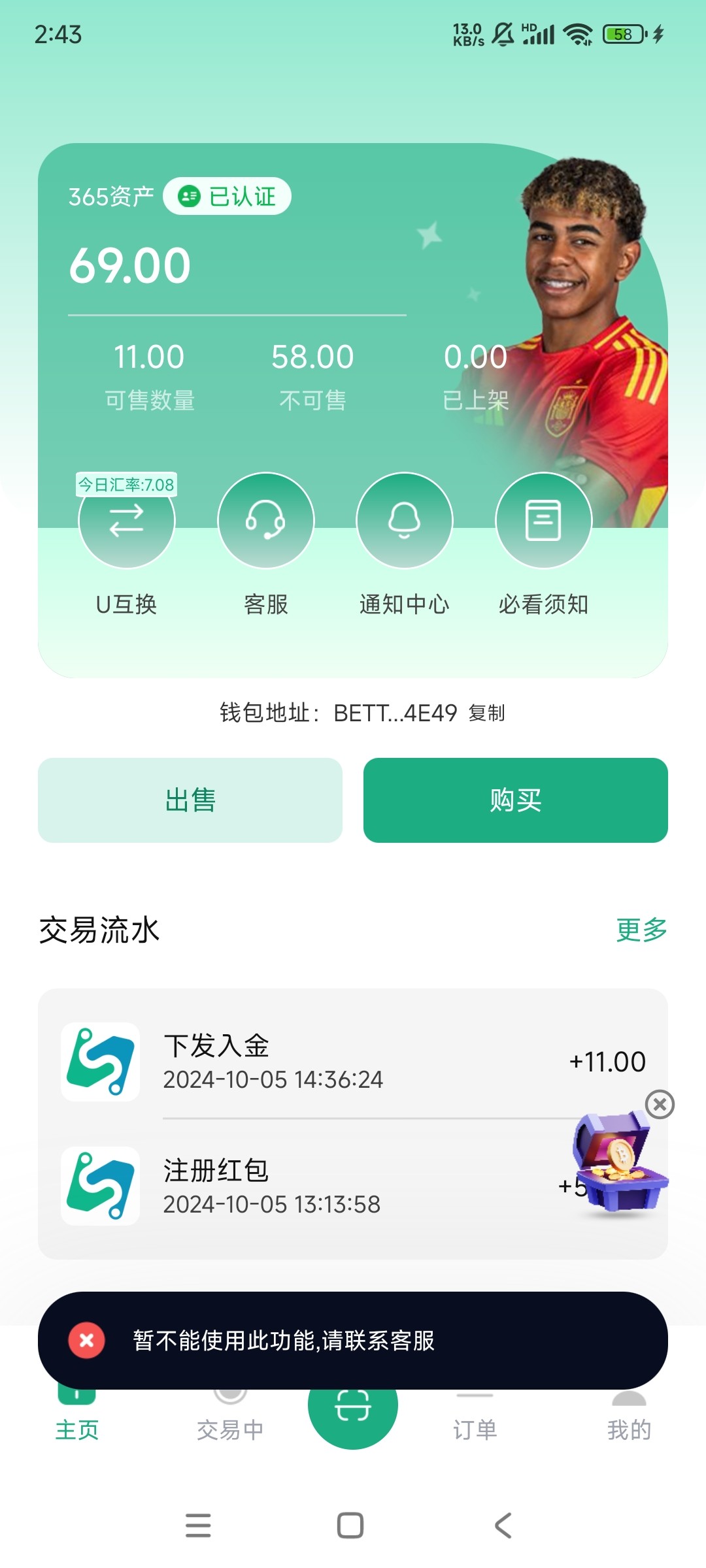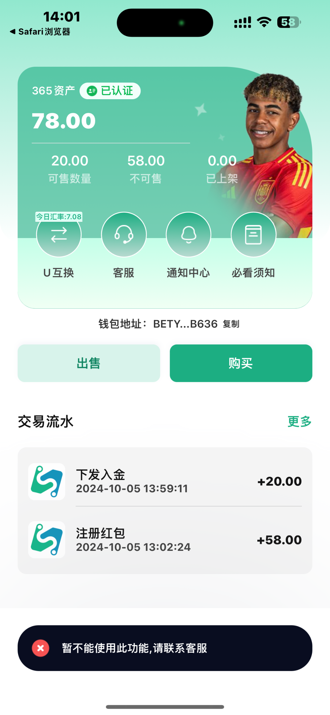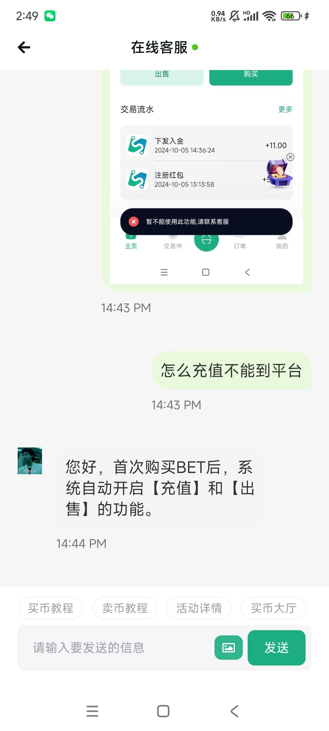 我刚才试了一下,662充了10    打到60提到365这个钱包了    然后我想把送的58回充  充一百结果账号现在无法使用该功能  要联系客服    客服一直一句话    充值才能使用  我也是无语这个钱包了