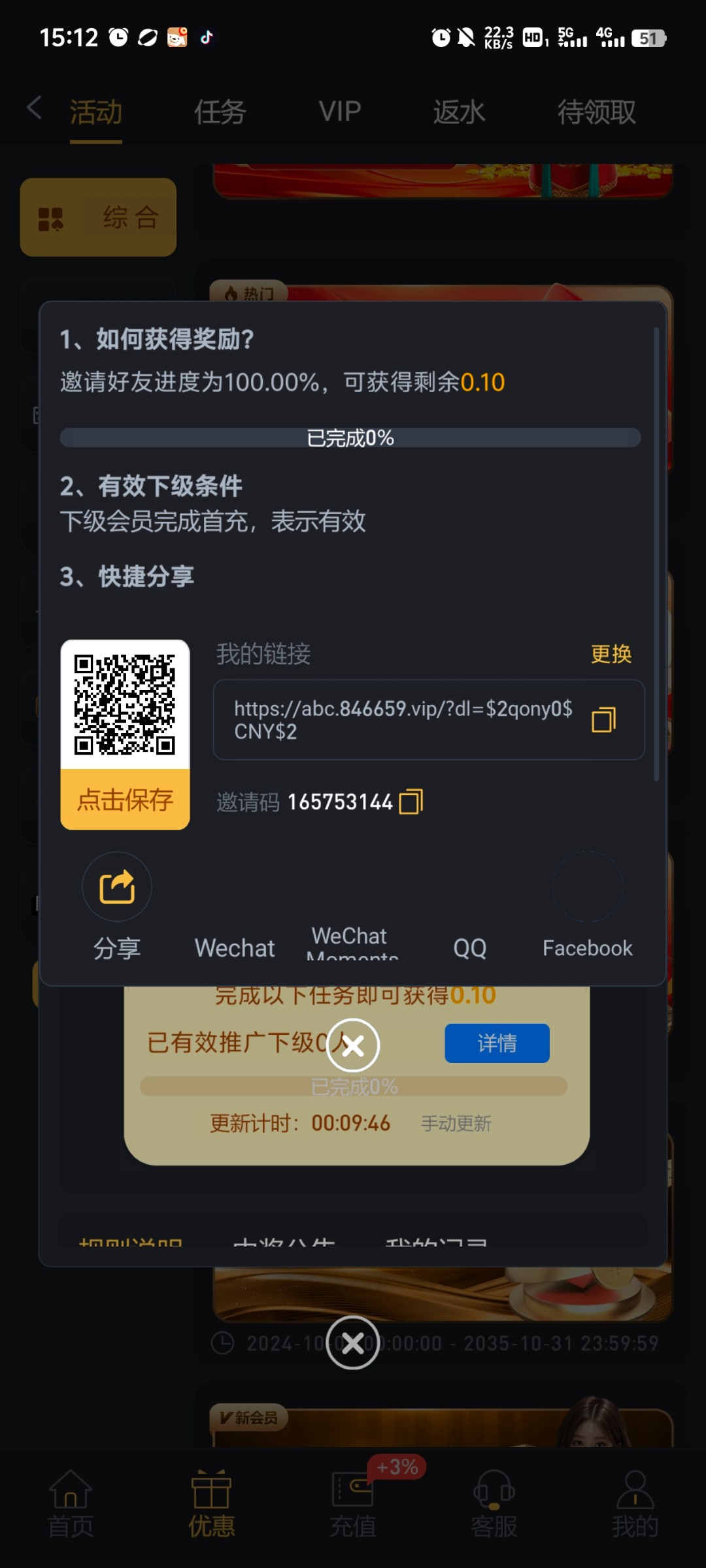 白嫖到了,注册送了后,用别的充值方式充值到662多少都行,然后打完流水提现10到365钱包,这个注册的58就可以充值到662了