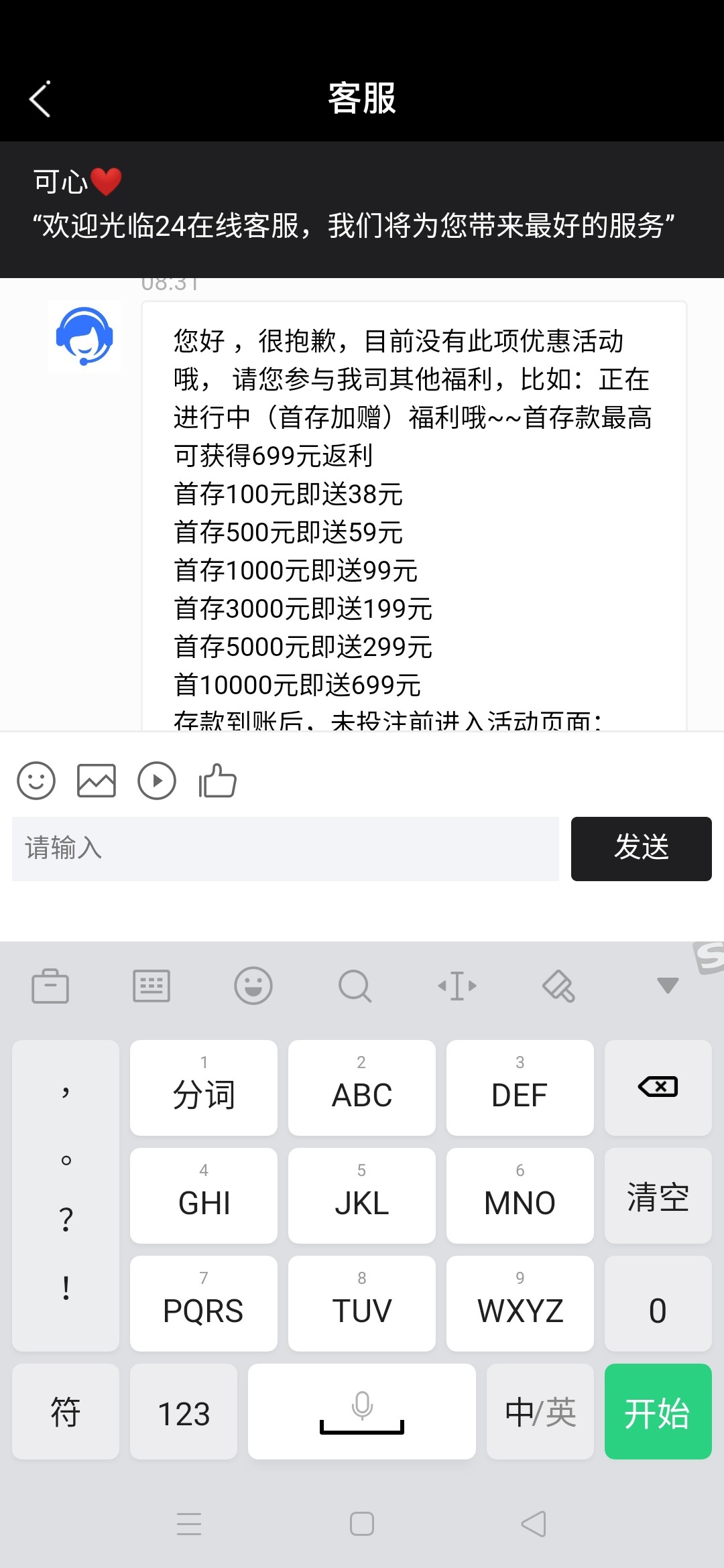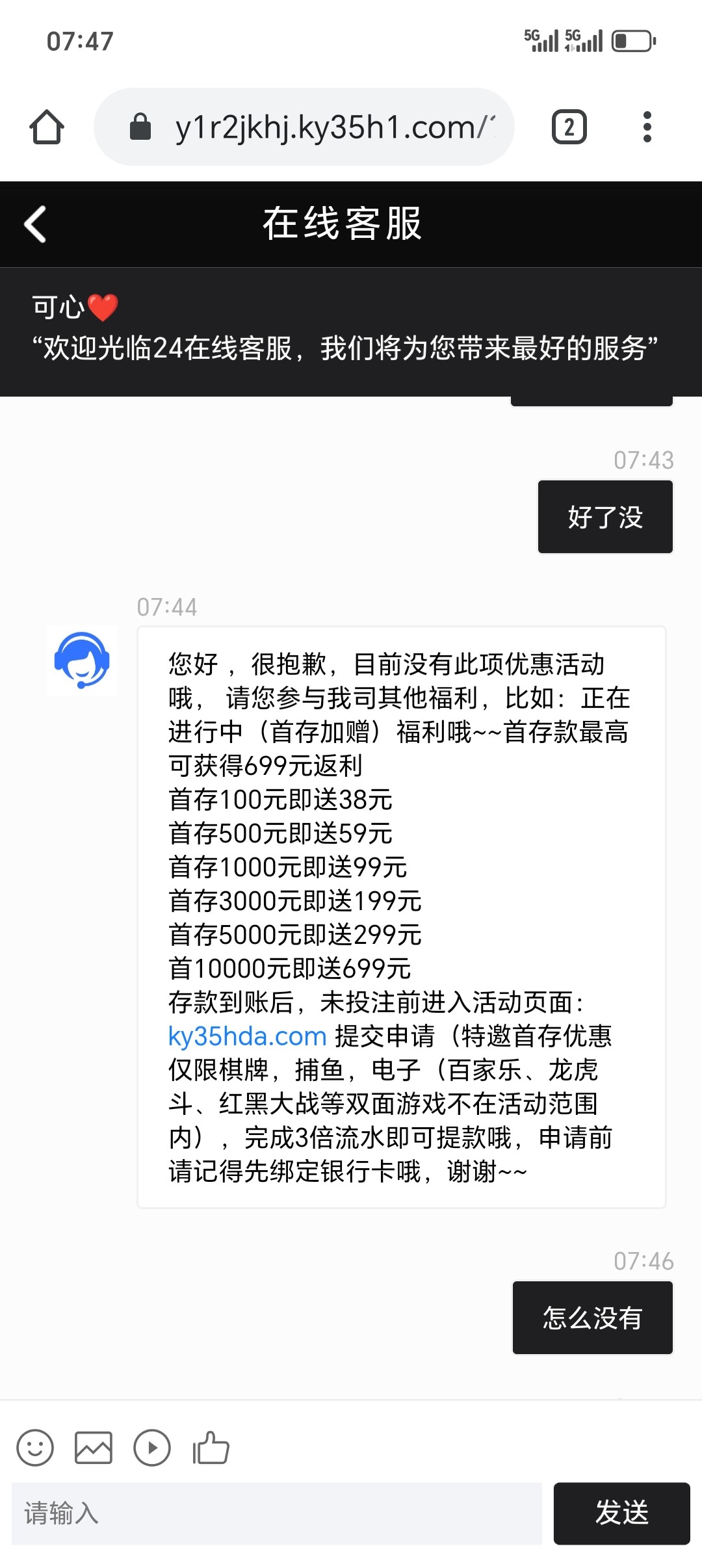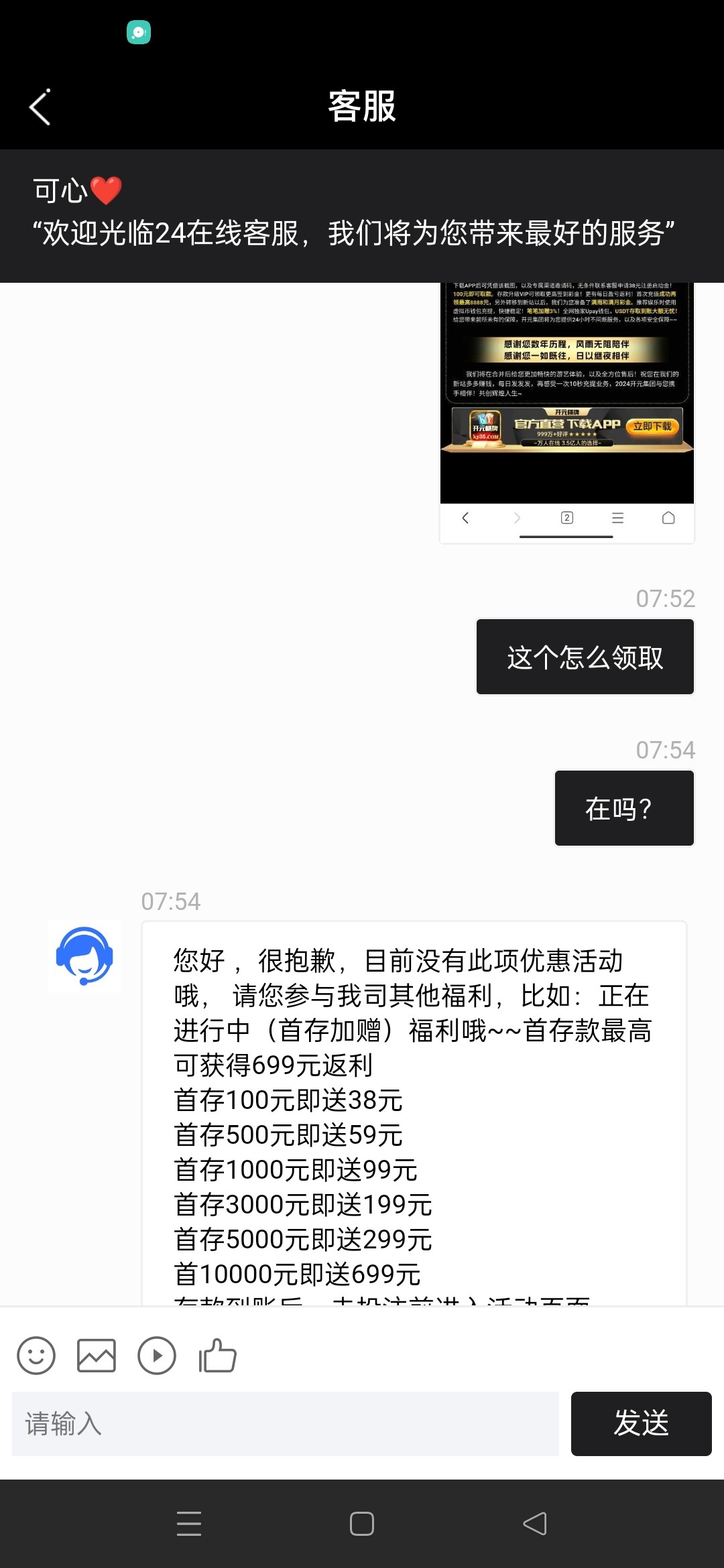 你领到的截图呢客服说 您好 ,很抱歉,目前没有此项优惠活动哦, 请您参与我司其他福利,比如:正在进行中(首存加赠)福利哦~~首存款最高可获得699元返利 首存100元即送38元首存500元即送59元