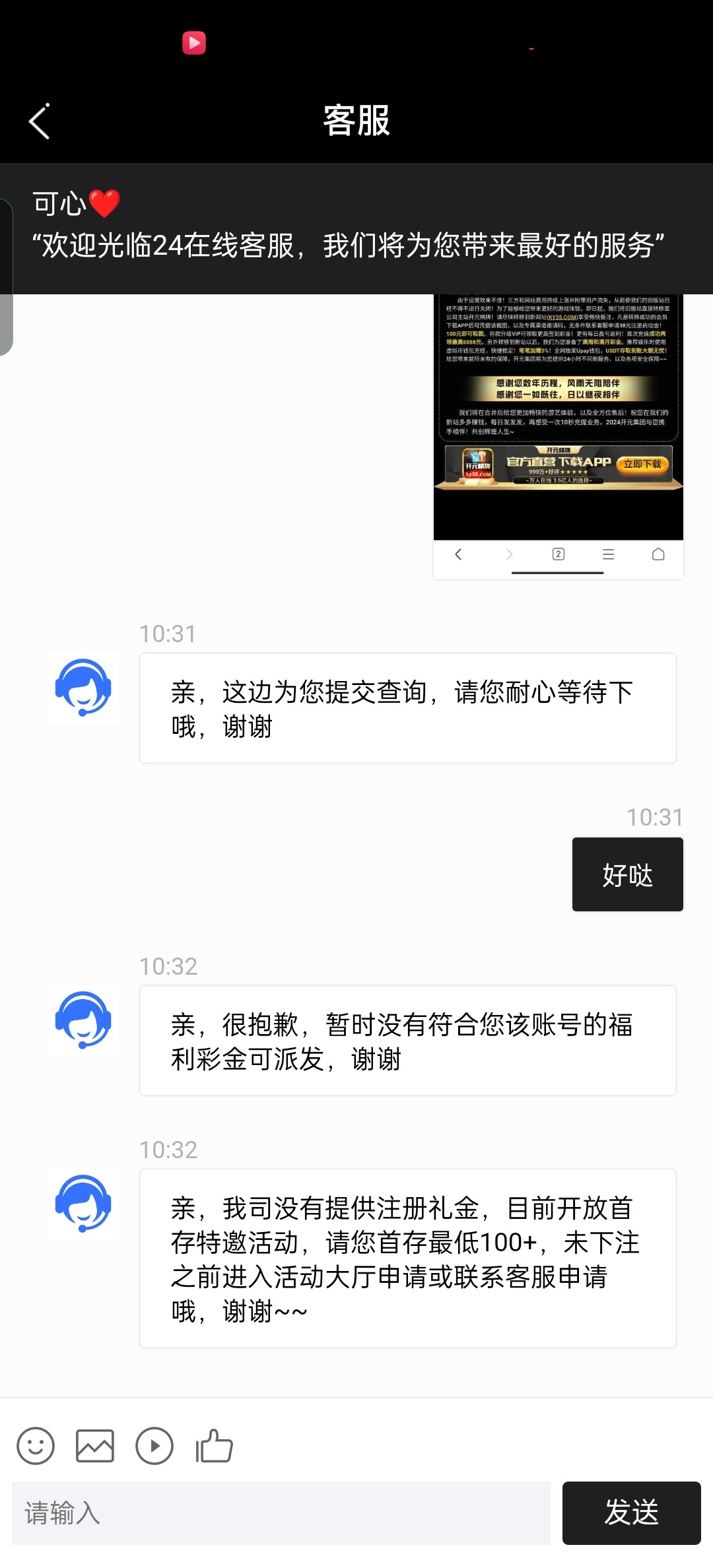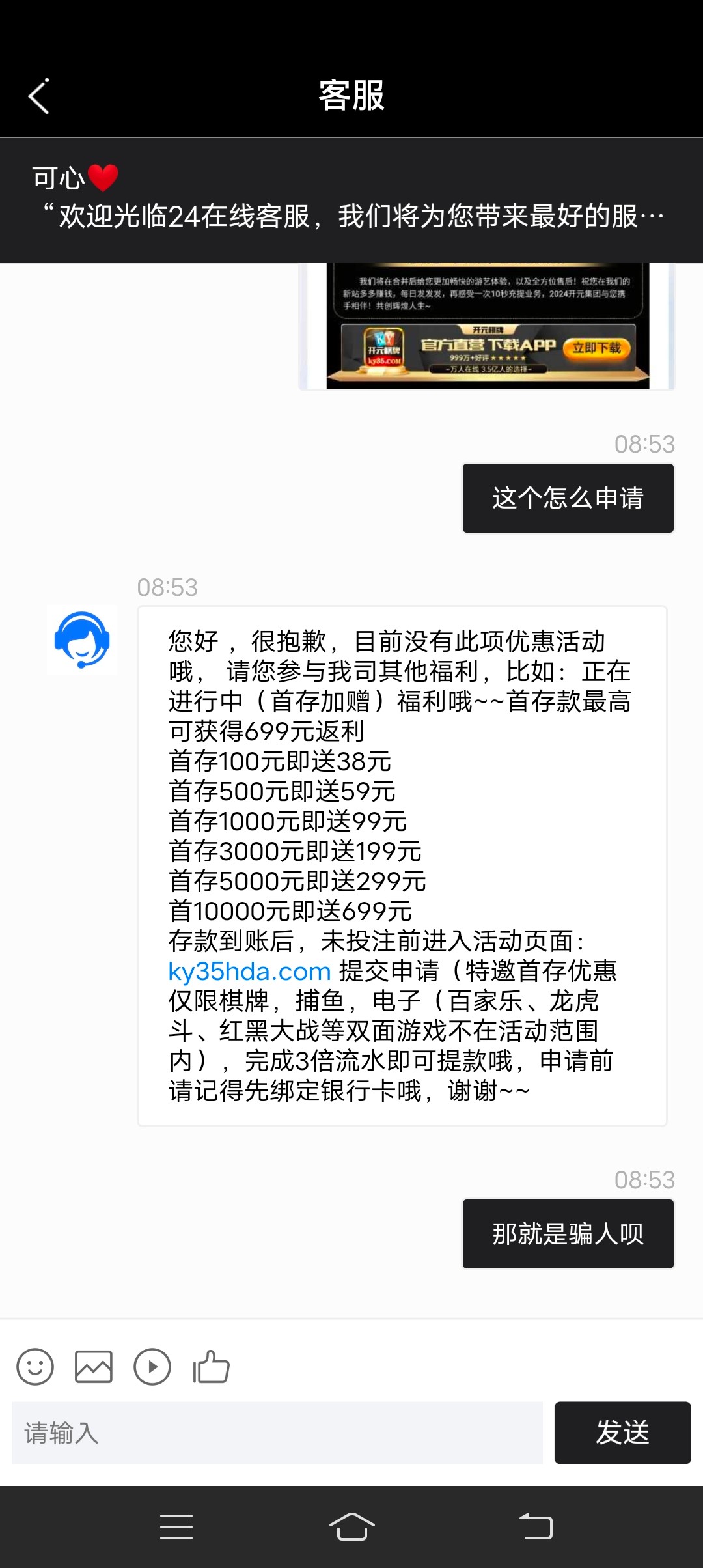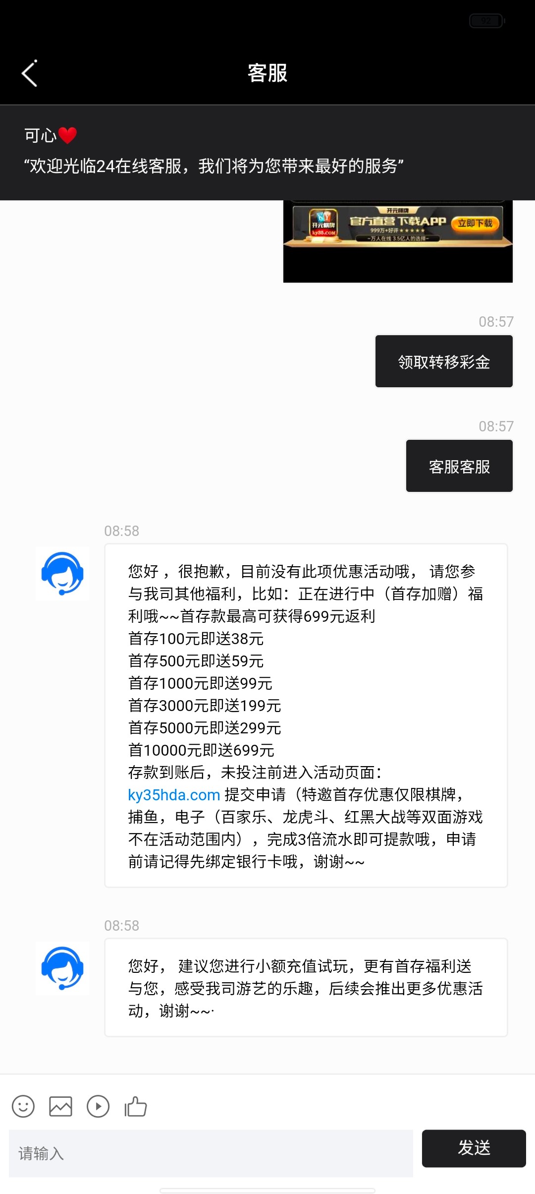 你领到的截图呢客服说 您好 ,很抱歉,目前没有此项优惠活动哦, 请您参与我司其他福利,比如:正在进行中(首存加赠)福利哦~~首存款最高可获得699元返利 首存100元即送38元首存500元即送59元