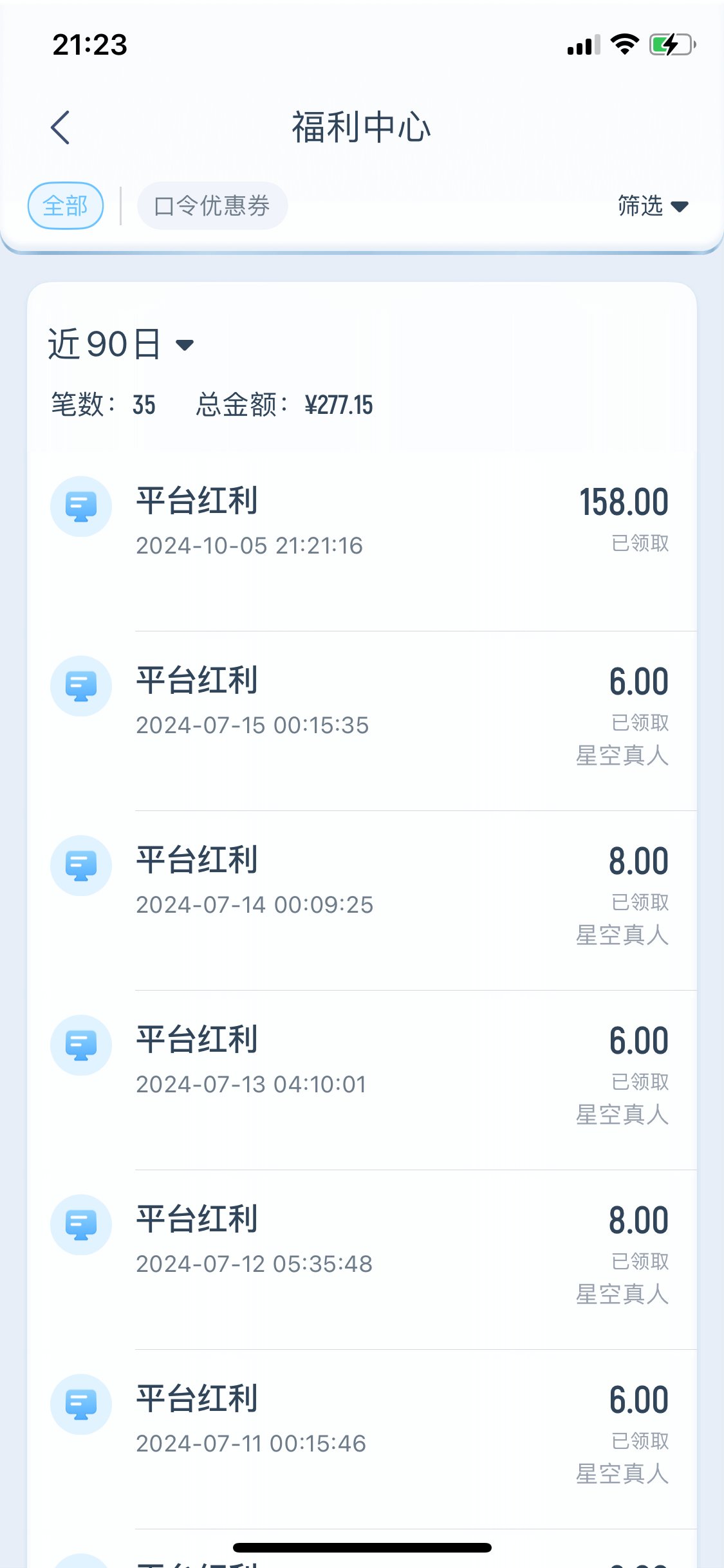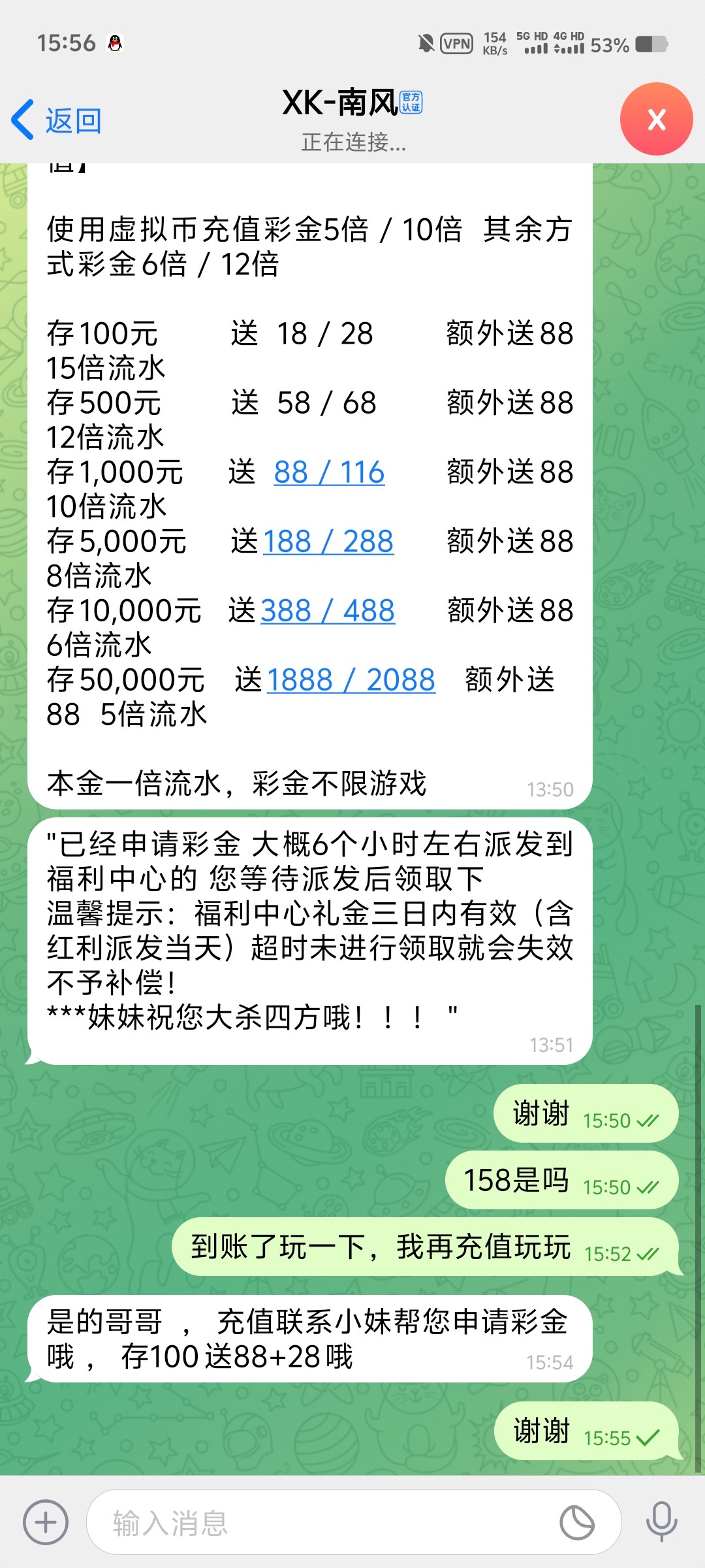领过158的去碰一下就是添加专属客服彩金18,前提是没有领过的,第一个就是昨天我申请的添加专属客服彩金