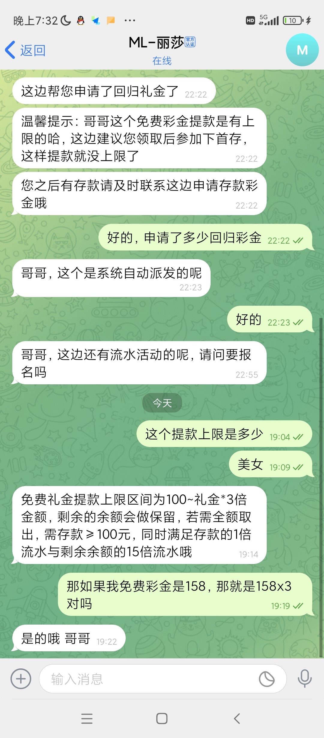 妈的米兰送了158,以为只能提100,158打到1300了,以为只能提100然后剩下充值,然后去梭哈ag挂壁了,然后就提了100,问客服没想到能提158x3,就是450多,然后剩下充值,少提350,草了