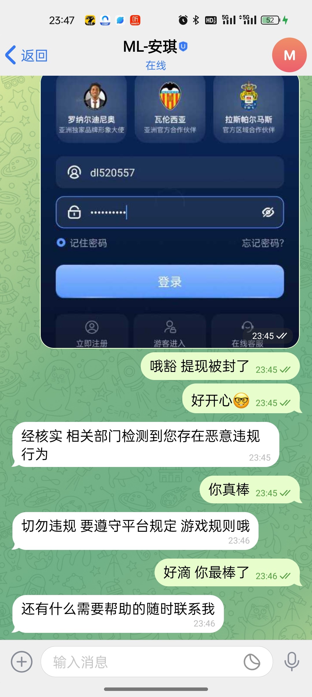 提一百你就笑吧 我存了149赢了1500直接说我违规投注 给我退回149直接封号