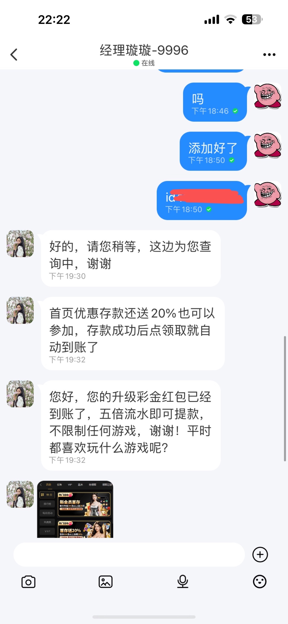 我的聊天记录 下载完app自动会添加一个客服 新平台的账号还是原来信博的账号密码 碰瓷就聪明点