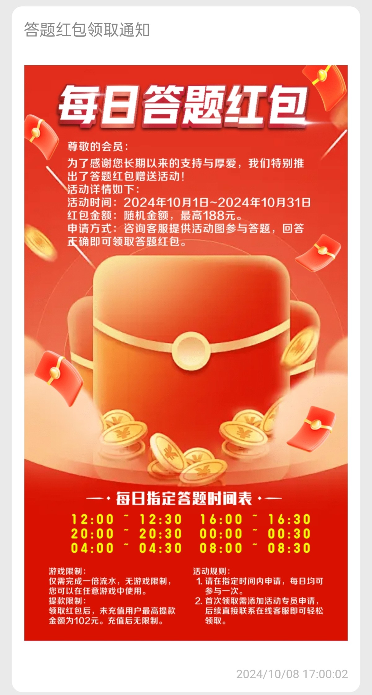您好,非常遗憾目前派发名额已满,每日限前100名哦,建议您后续多多活跃充值下注游戏,下个时段再来领取哦