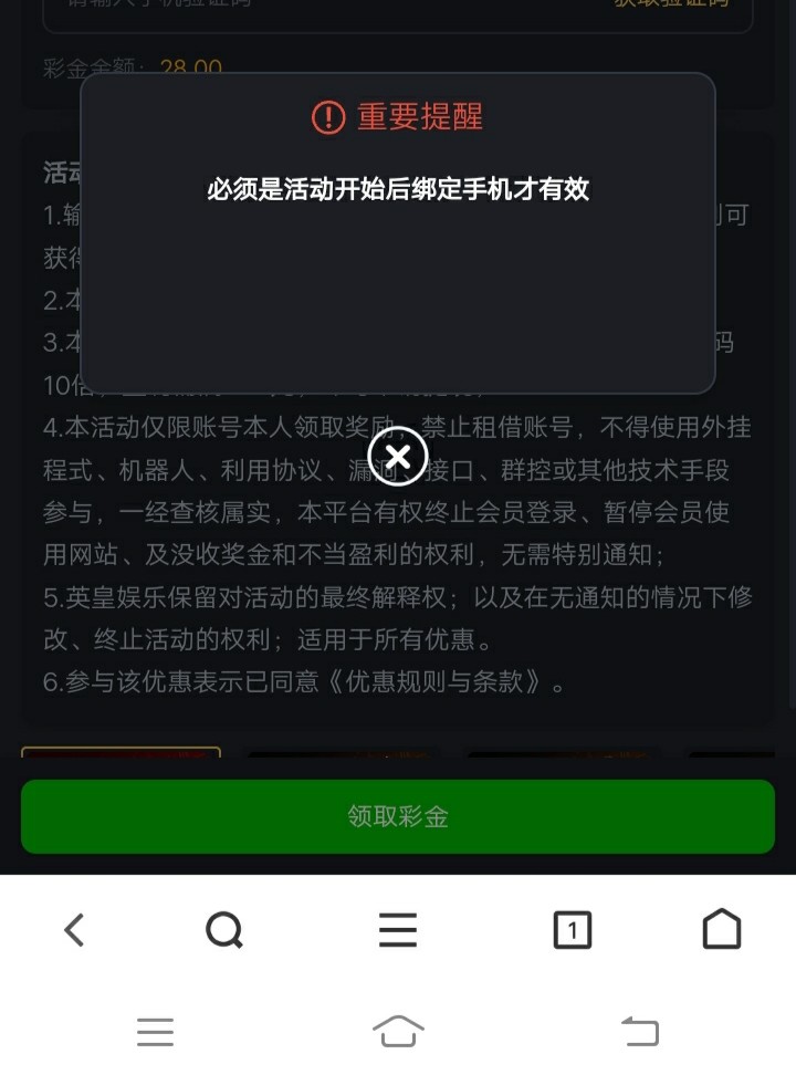 教你们一下,如果提前注册接到电话领不到彩金。显示必须活动开始时候绑定手机号。这时候去安全中心更换手机号,把特邀那个手机号空出来,重新注册账号领取,进去绑定你特邀手机号就领到了。我刚研究的领到了。