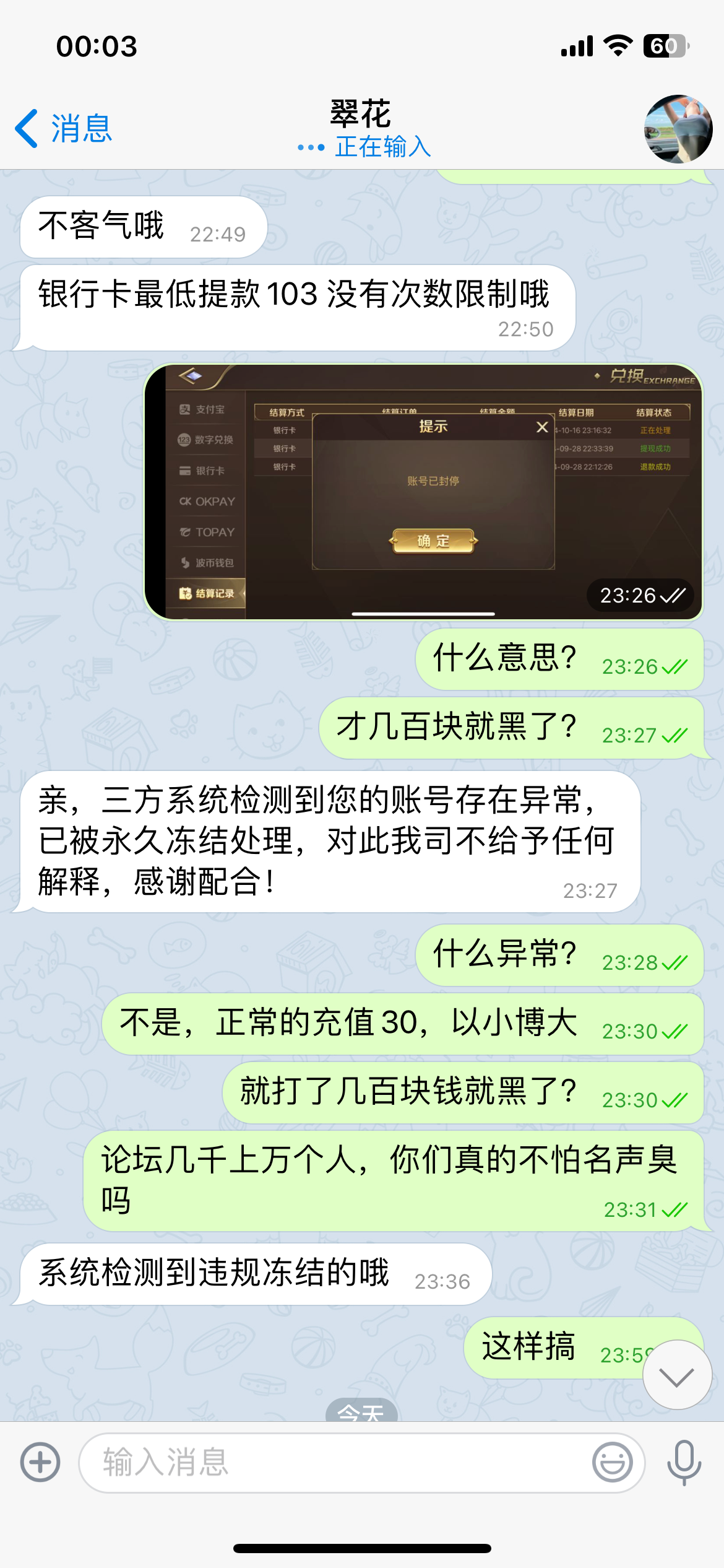 前段时间玩过一次1+1,提了1100说1+1最高提现500,刚刚以小博大去,提了600,直接给我号封了,正常玩的游戏,客服说有异常,大家避下雷