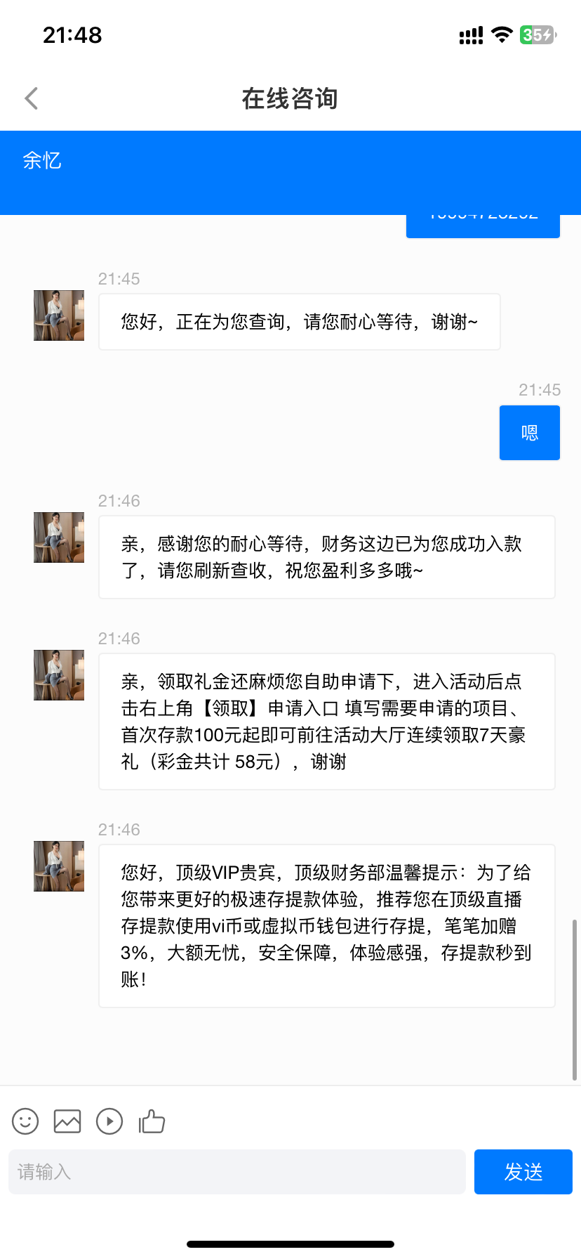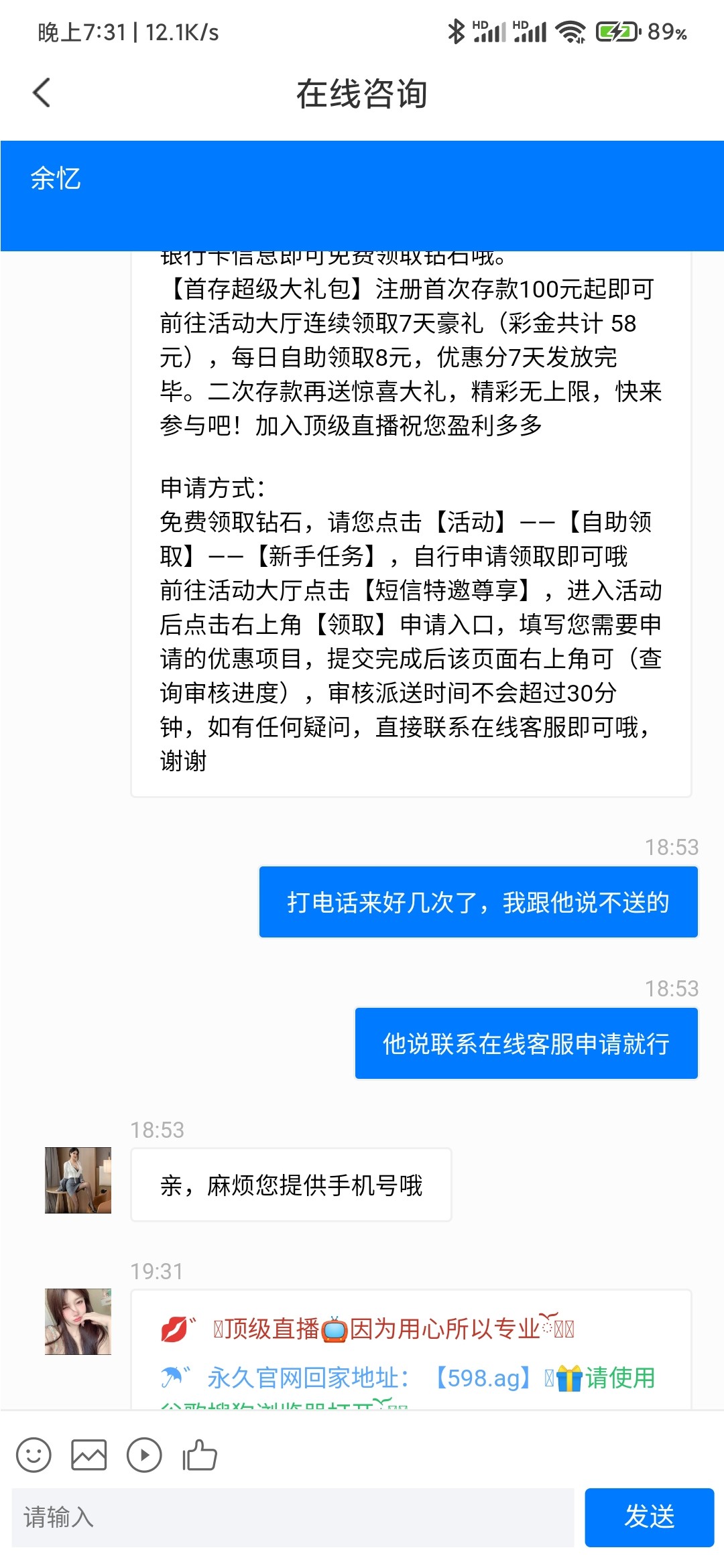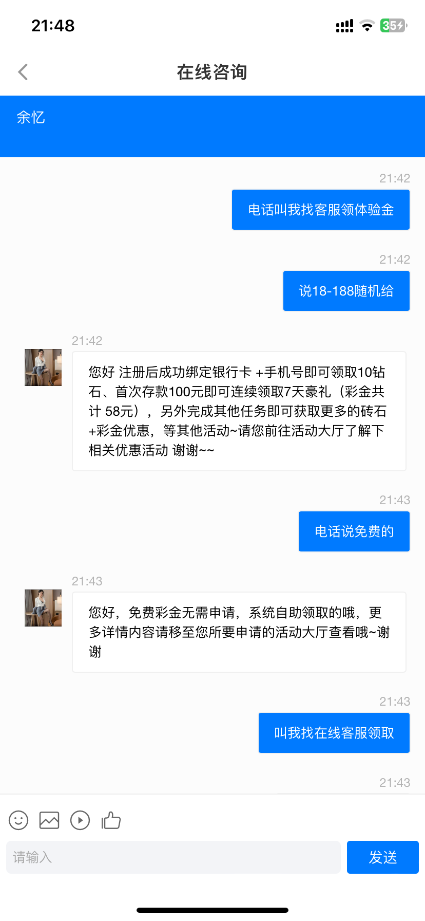 接到电话的、去申请叫你充值的你就换客服、我跟那个傻逼昕柔申请一直叫我充值、后面换成余忆就给了、自己看我话述