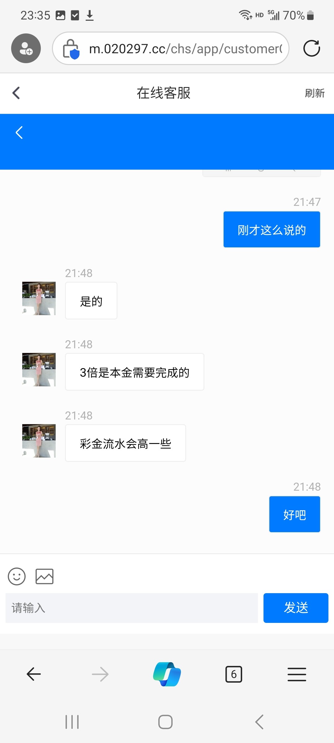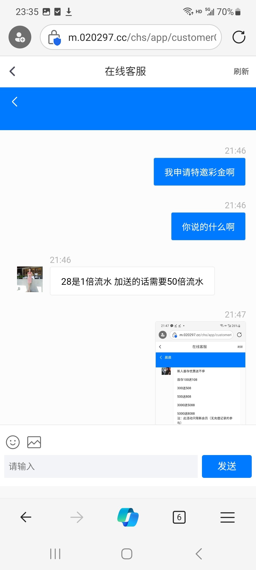108要充100,108要20倍流水,然后客服说也可以100送28的一倍流水,本来打到300准备提了,结果最低500才能提,看之前帖子说黑,但是到了得吃