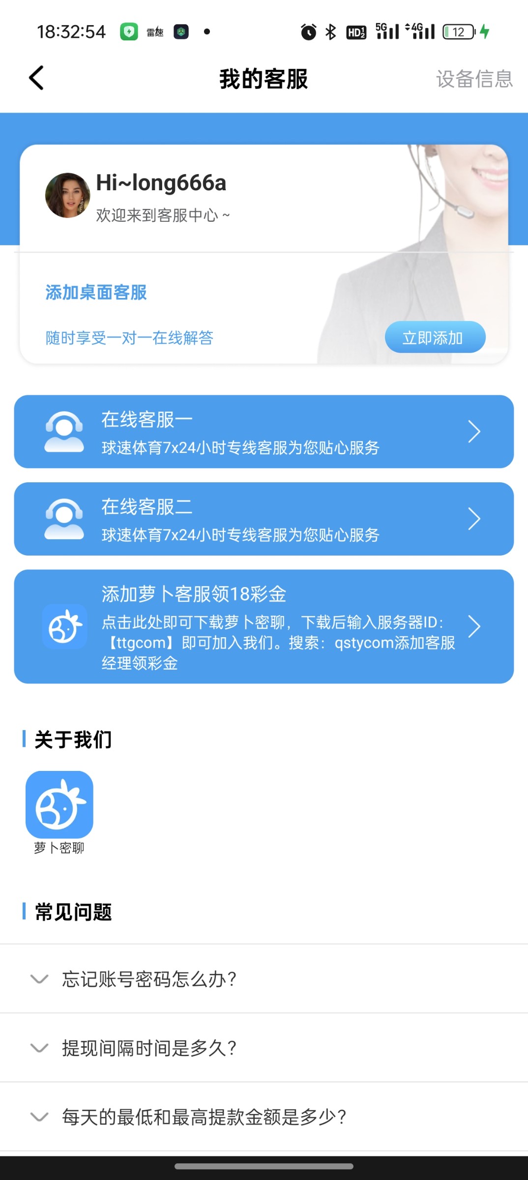 充值过的的兄弟下载添加萝卜客服领取18彩金,亲测赠送成功