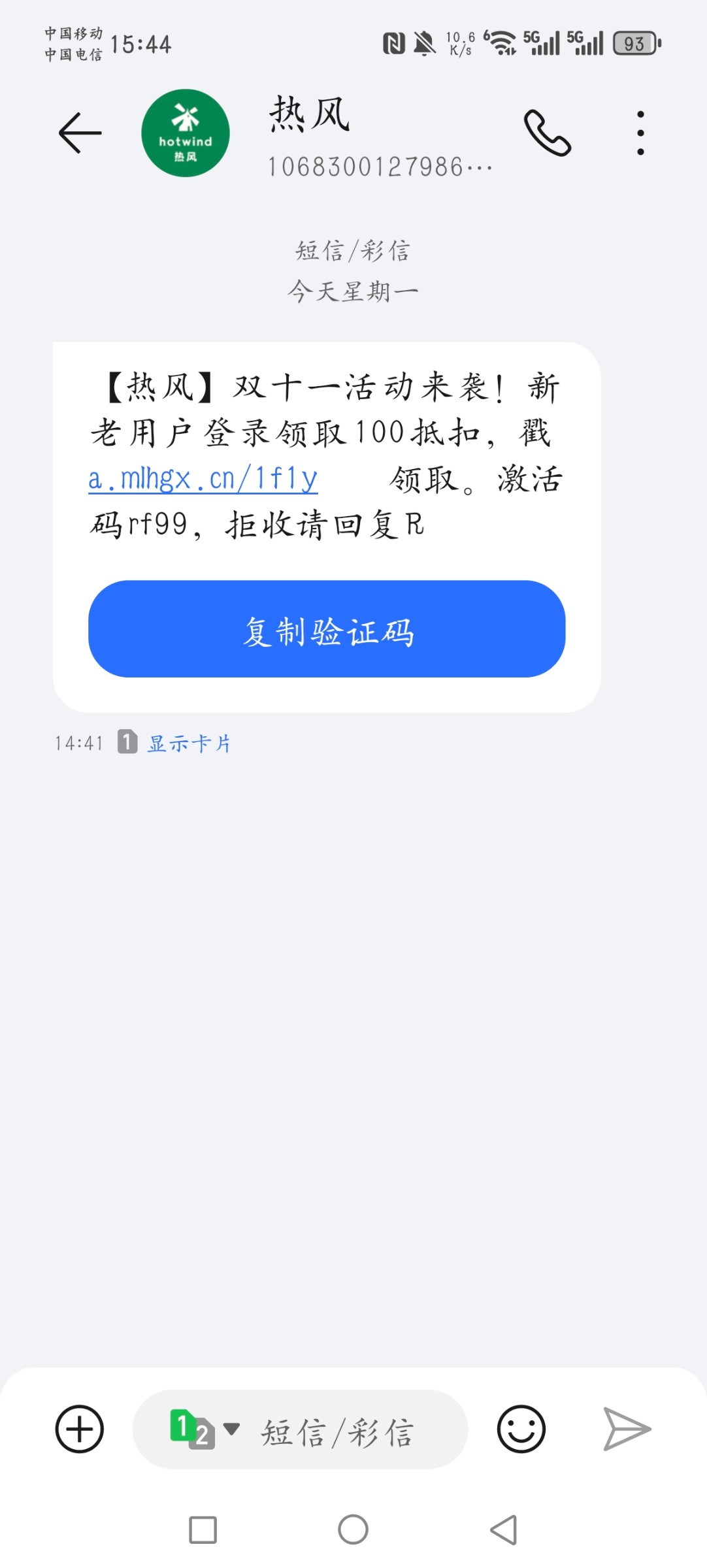 【热风】双十一活动来袭!新老用户登录领取100抵扣,戳 a.mlhgx.cn/1f1y 领取。激活码rf99,拒收请回复R