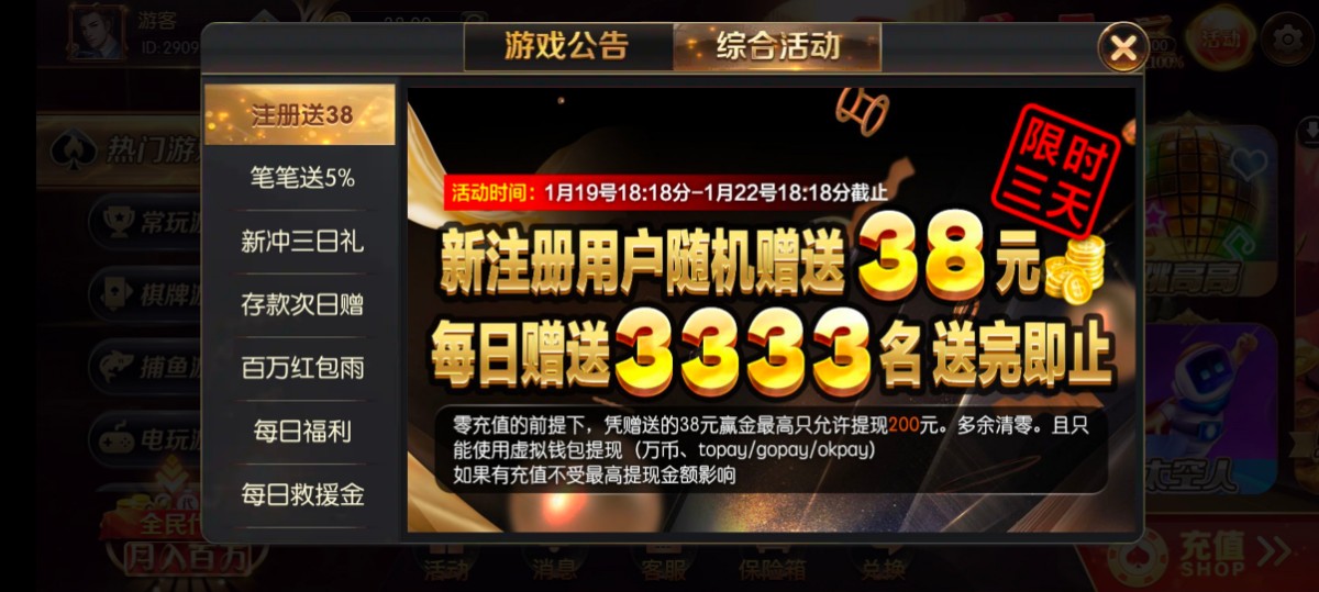 新用户下载注册每天送38每日赠送3333名,可以换ip去试一下,白嫖就行不要充值 官方平台链接