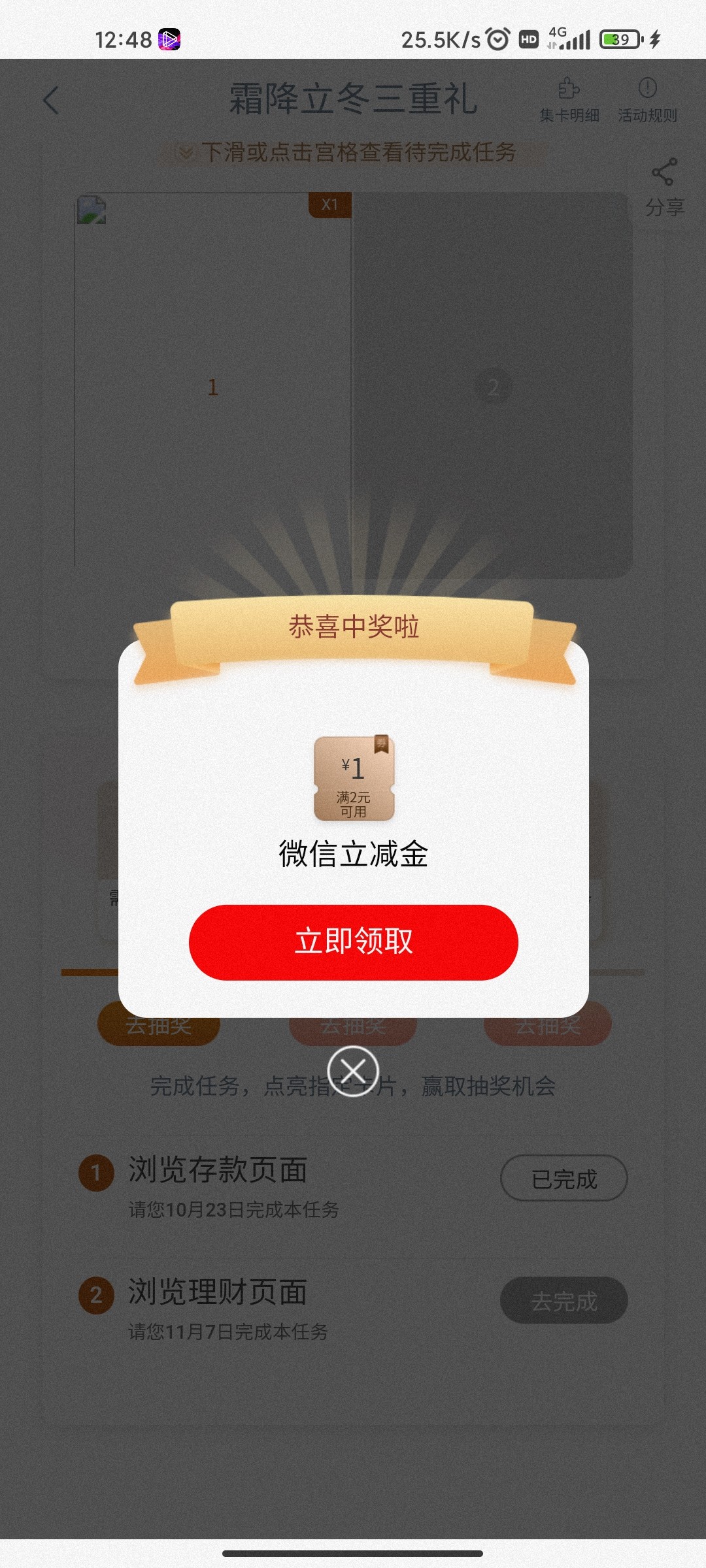 老哥来试试运气吧,我就刚开始任务中心抽了3次中了2次立减金,后面又坐了3次就没中了,那节气活动感觉保底有1块钱吧