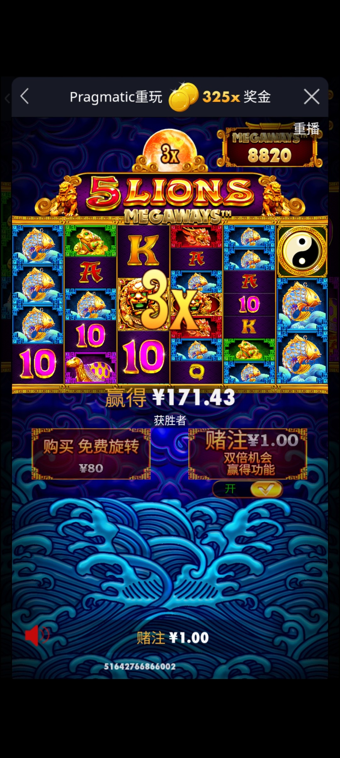 平拉x3给了325倍325块 不是171 狮子没给x3 就104倍