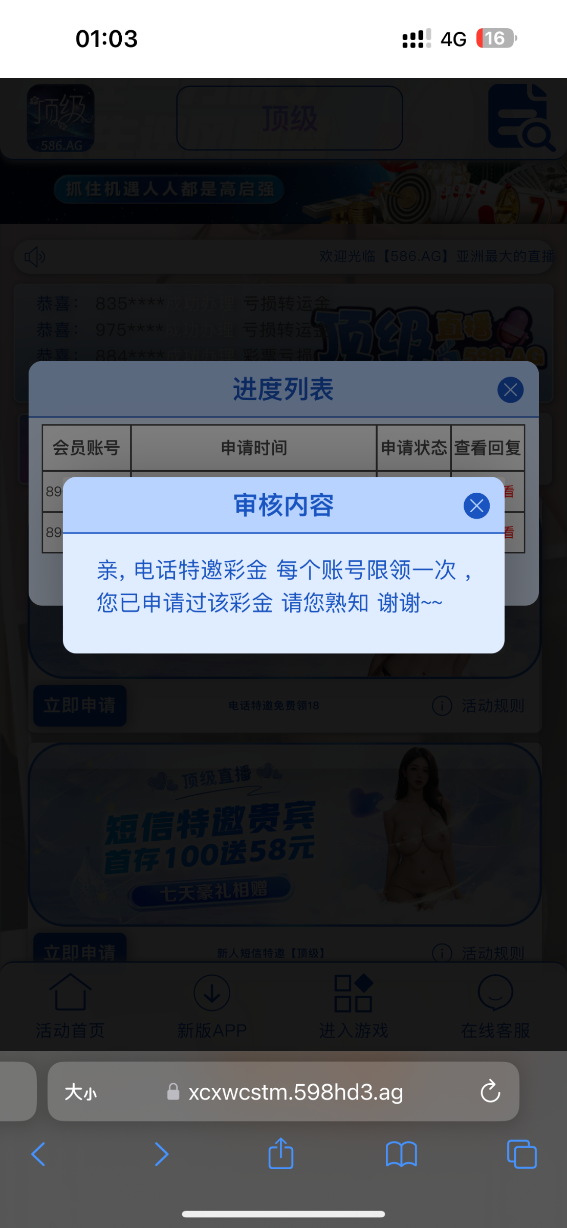 586.ag 找客服要链接申请,第一次碰瓷别人发的给了,打挂了,后面又打电话来又给了一次,白嫖1000+