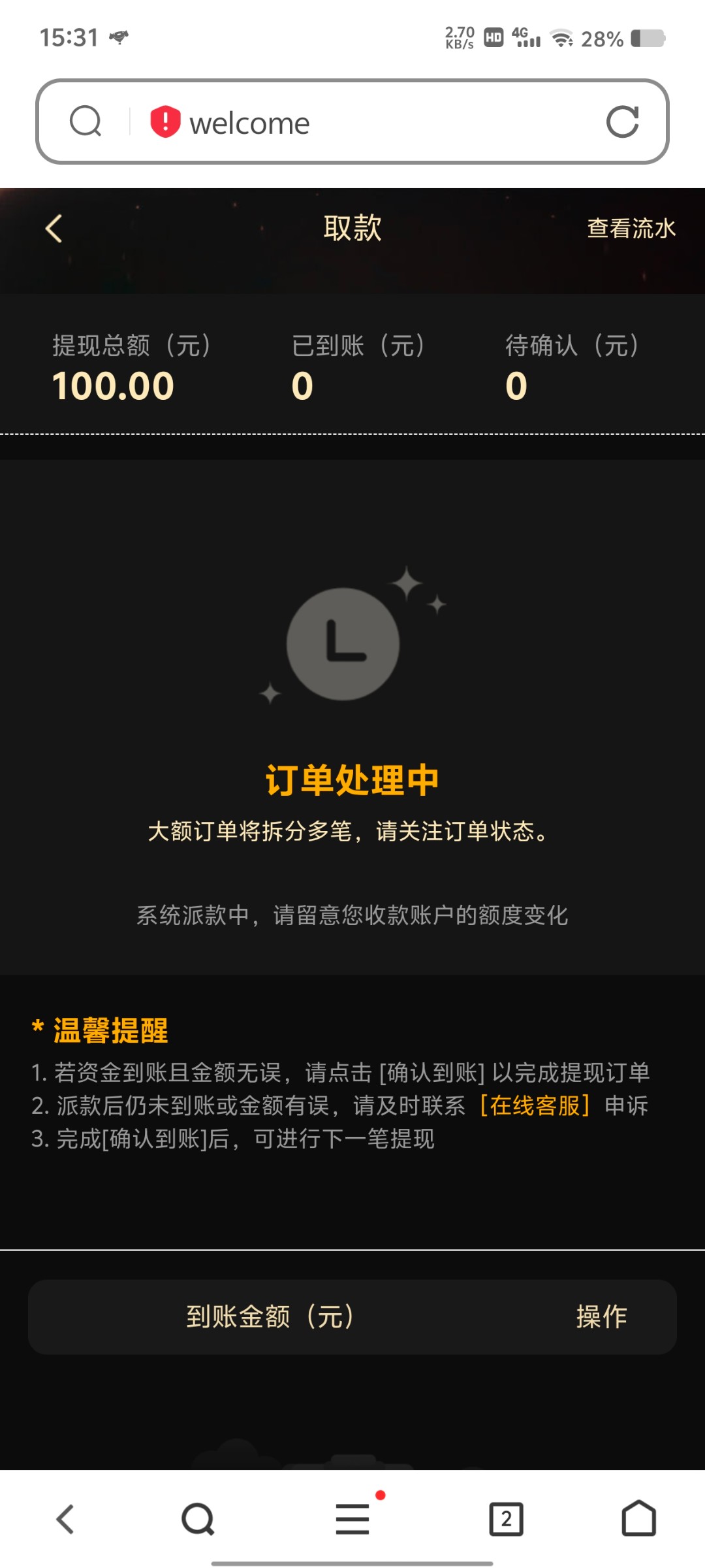 没领到抢到红包四块钱打捕鱼到200不敢提200就输了100等流水刷新好掉看看能不能提现