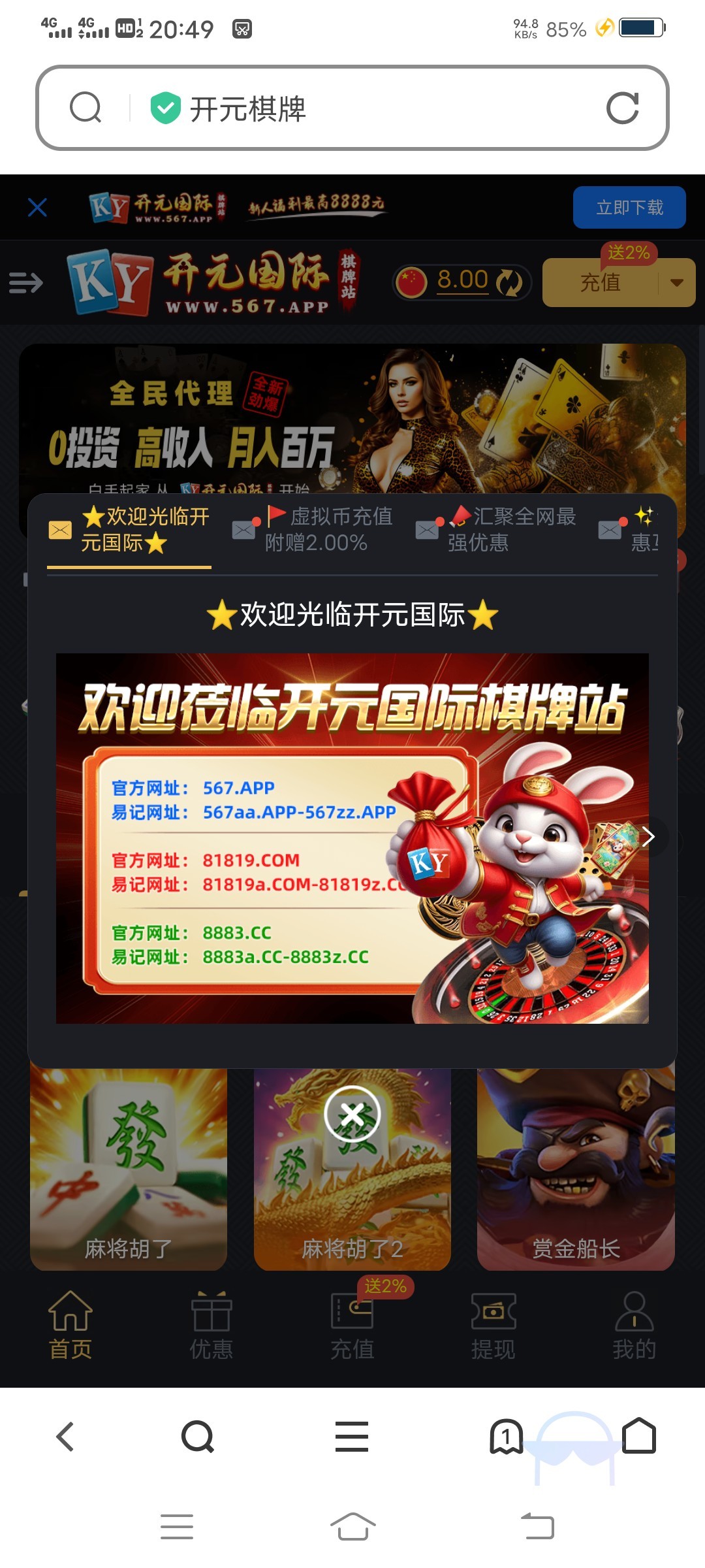 接到电话登录进去过了一分钟送了8,有号没接电话的去看看,有就有没有算了,是自动送的。网址567.app 或者电话告诉的网址330266.com