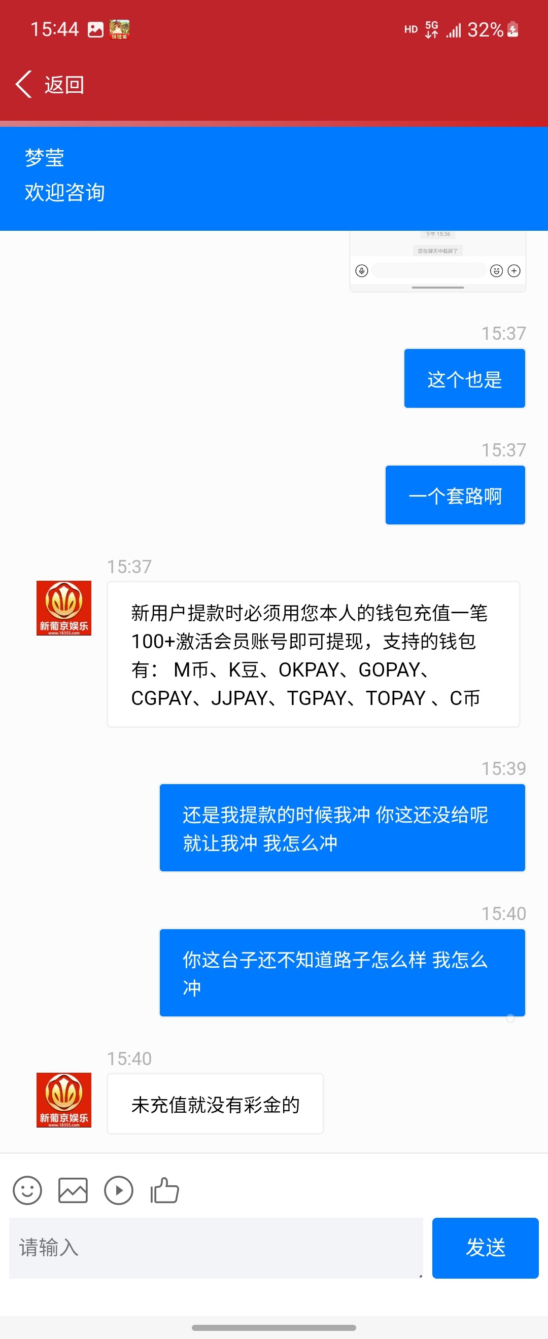 黑台充值107 什么都没领提了200四个小时了不到去问一直在审 说退回账号就秒退回故意输到一百提现还罚流水 罚水还罚平台自带棋牌