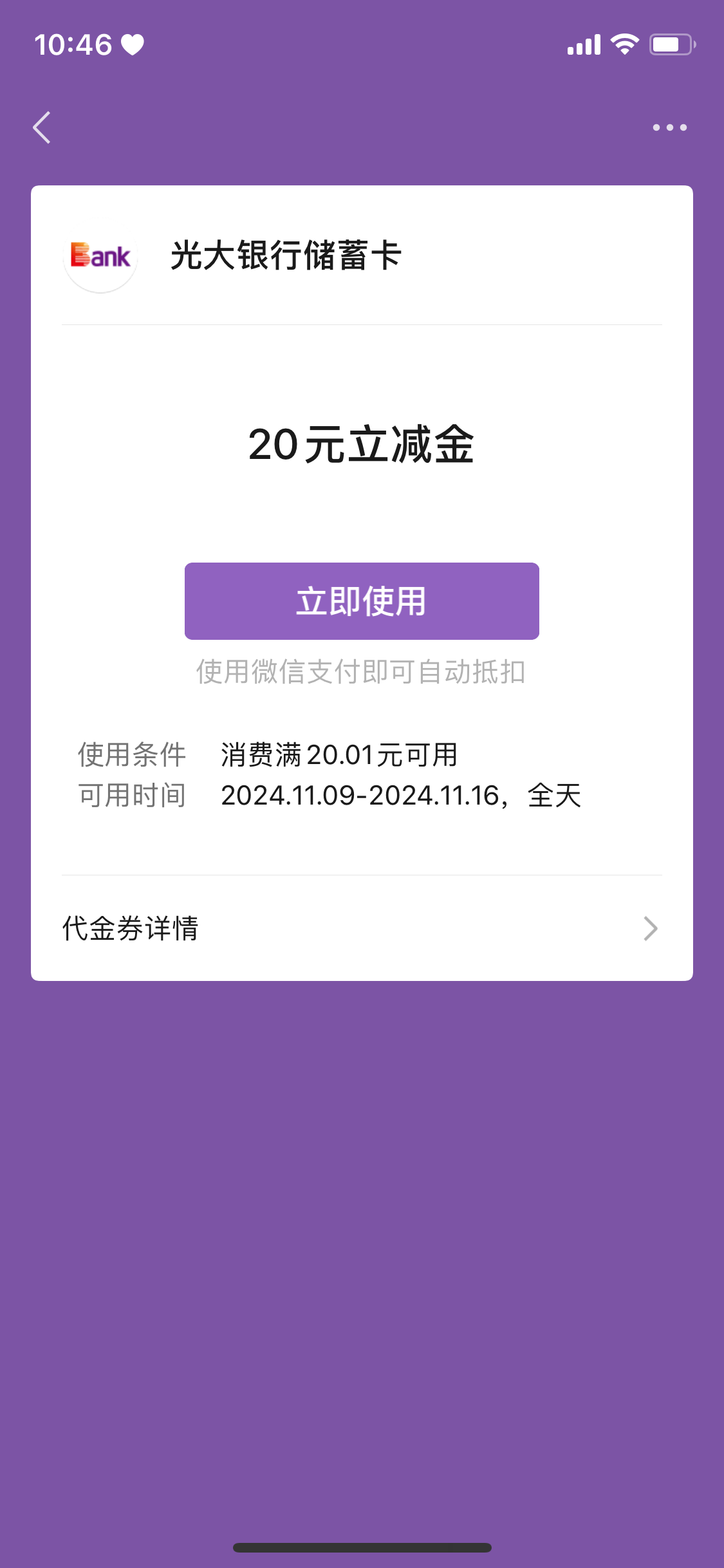 @a2932526 ,点外卖啊,买东西啊,反正只要是用微信支付,选光大银行卡都可以减20