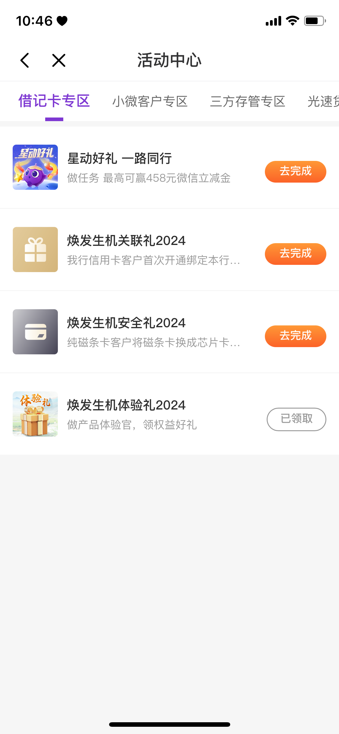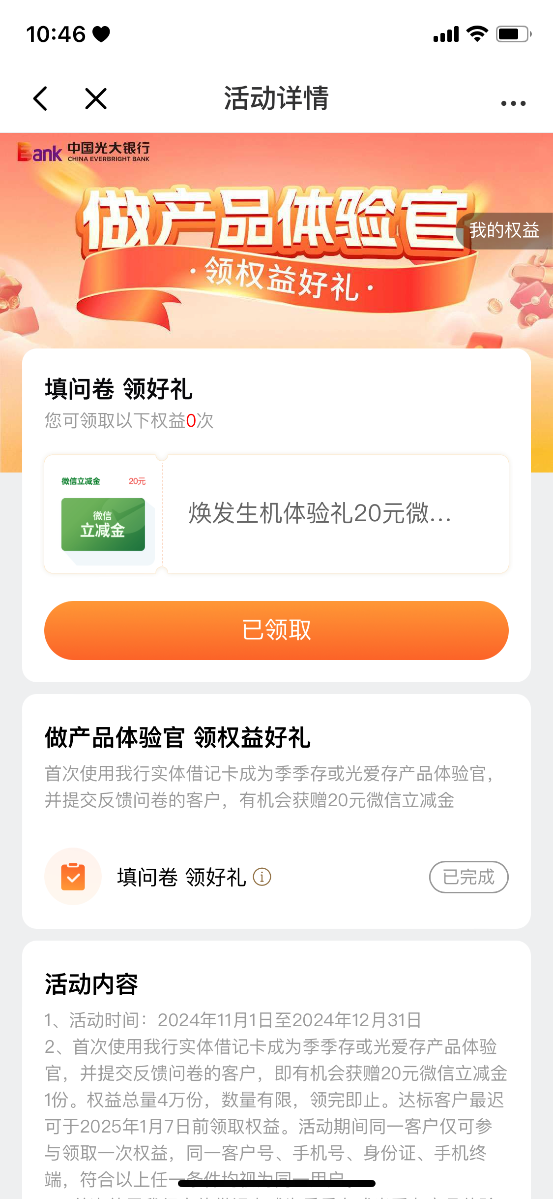 有光大银行的老哥,去权益服务,里面有一个 焕发生机体验礼2024 去签约,然后提交一下问卷,就有20立减金,先到先得,名额不多了好像,领到了,马上解约就行,不扣钱