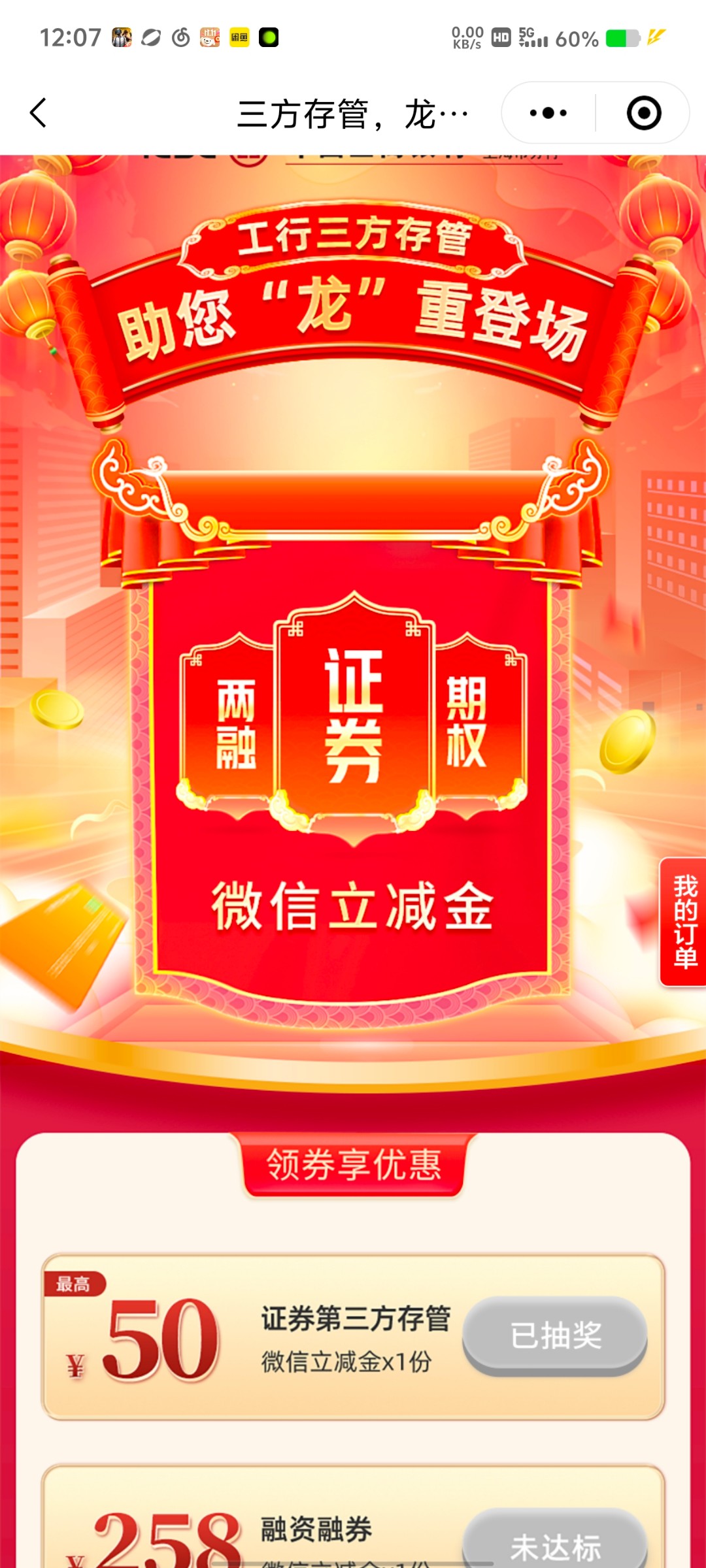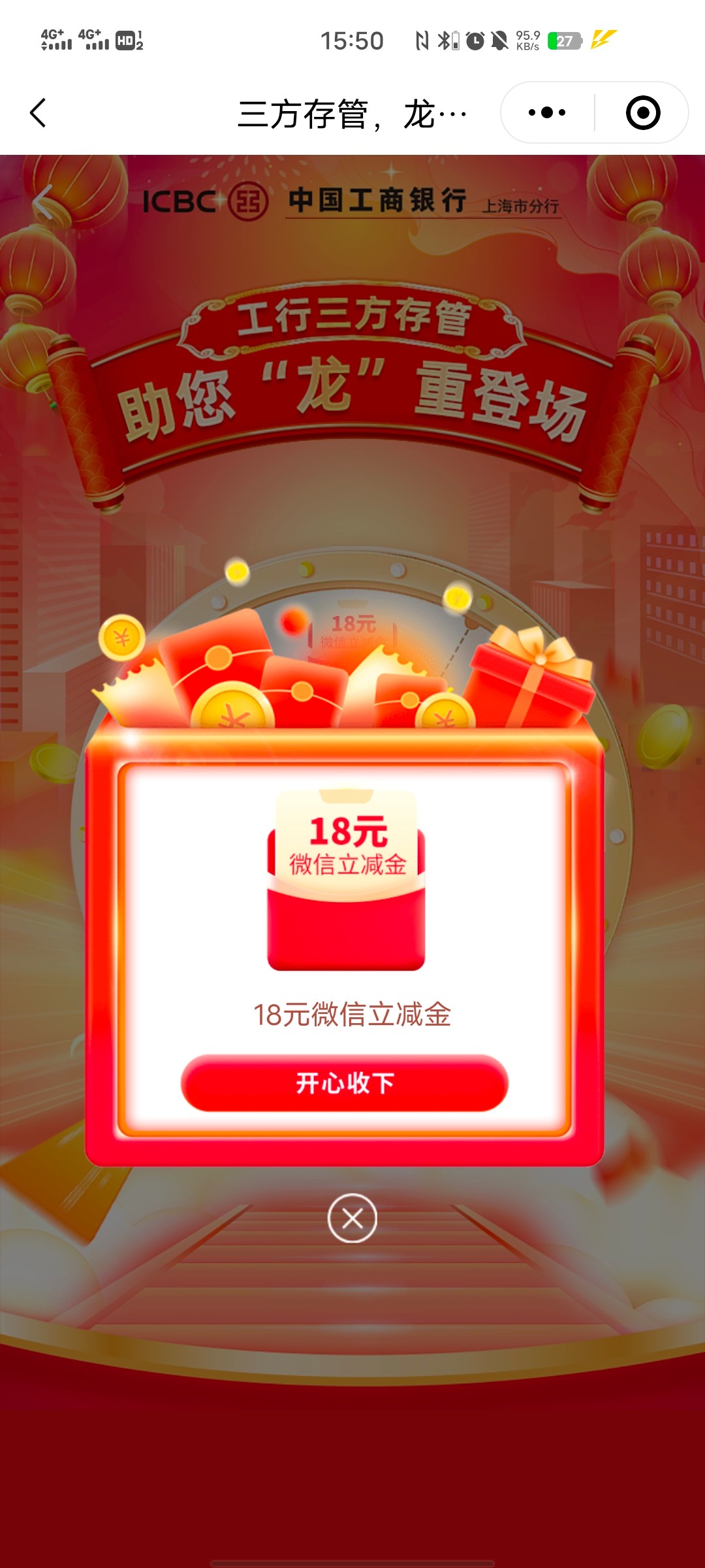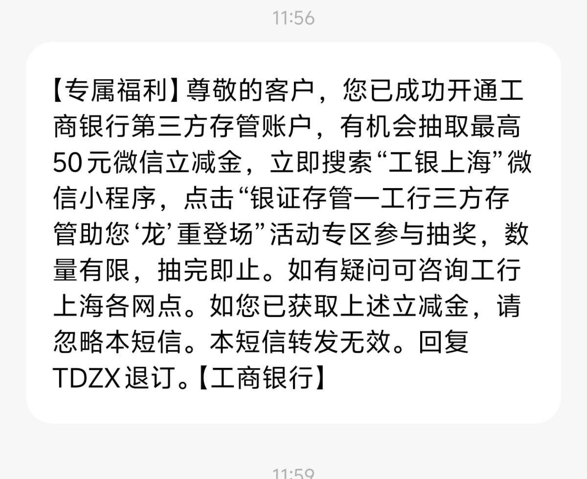 我是看到短信去的不知道没短信的有没有估计的话应该都有的打开微信搜索(工银上海)然后滑下去选择那个(银证存管)认证完银行卡以后然后再返回再点击活动图片工行三方存管就可以抽微信立减金了没钱吃饭了老哥赶紧去撸,人多了就黄了
