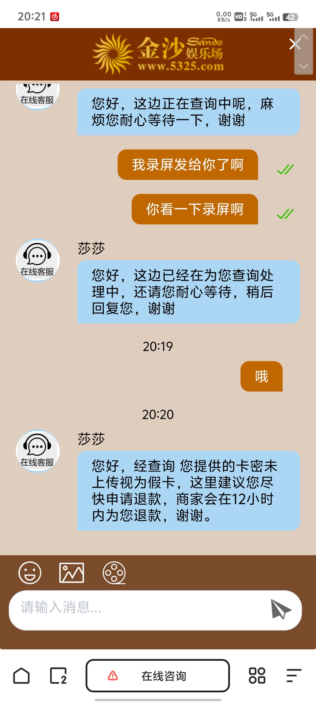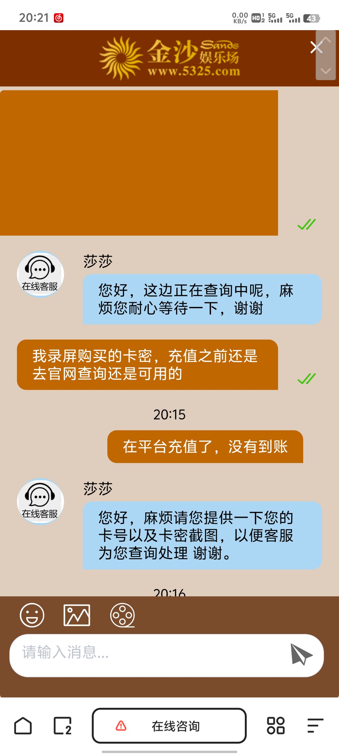 录屏充值提交的,提交前还在官网查询了还是可用的,提交了就不给到账了,还说我买的是假卡密,纯纯黑台一个5325金沙曝光一下