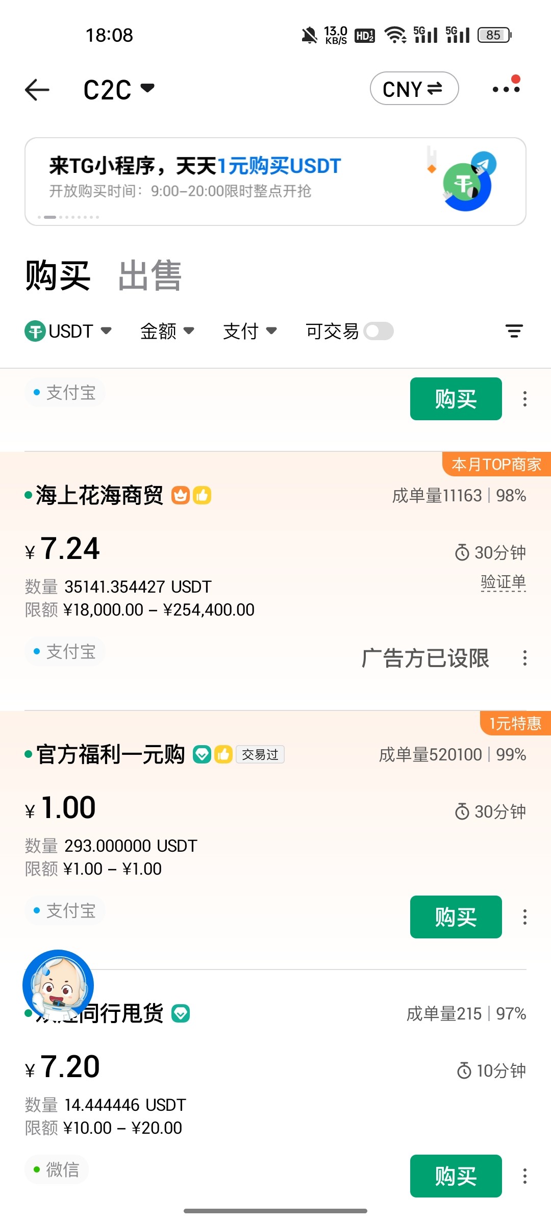 自行下载火币app,然后在交易那里点法币,购买那里有新人活动1元买1u!自测,我自己到账2u了!不过要买5u冲进去才能提出来