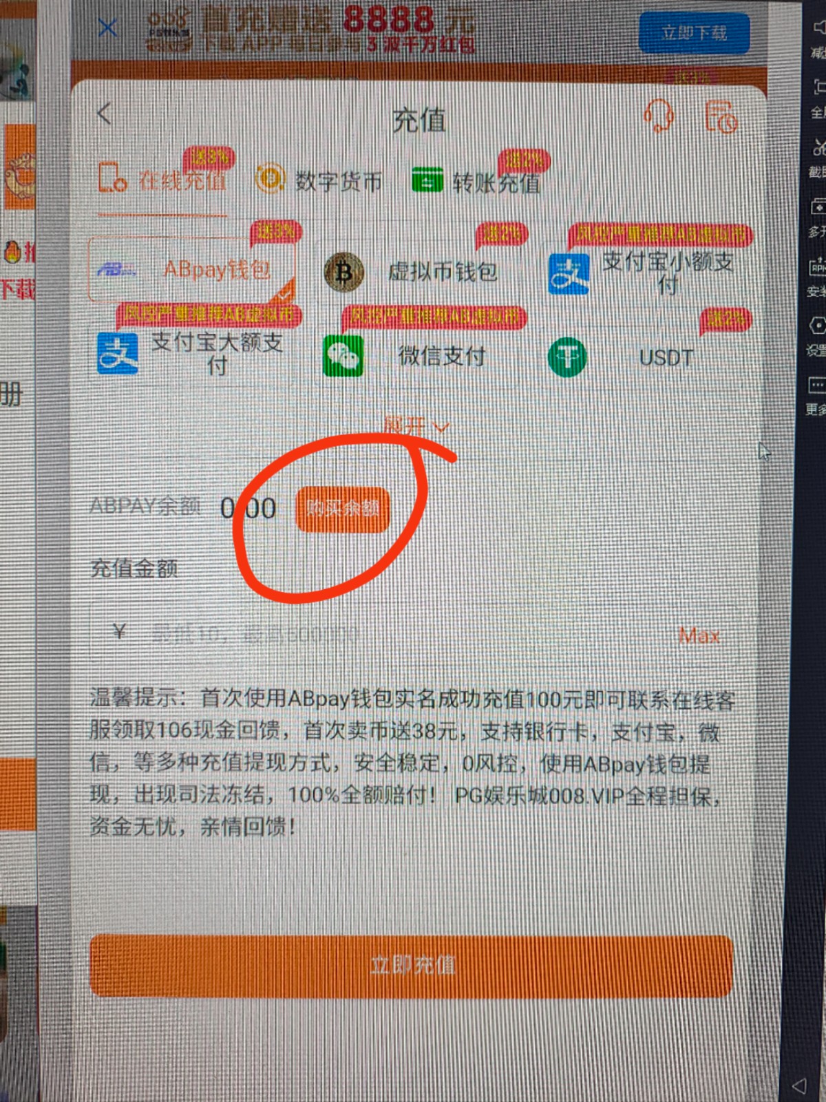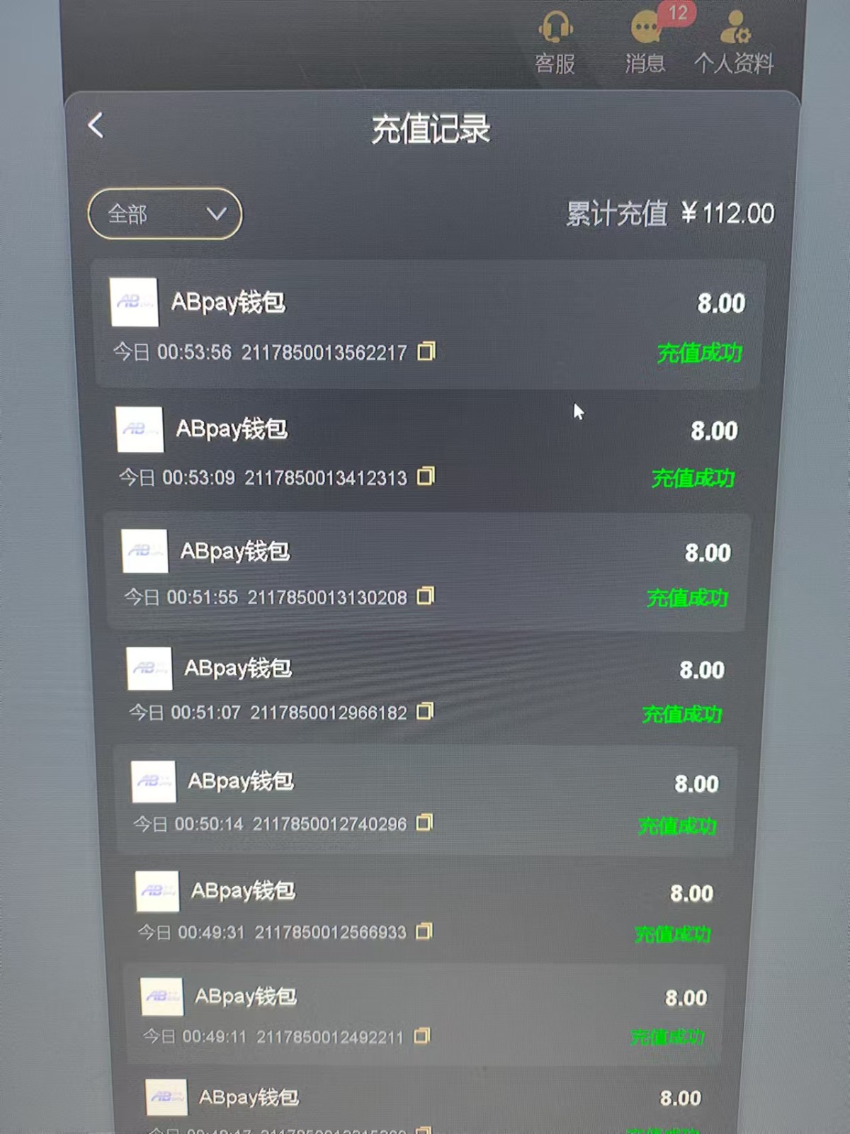 注册完账号点击充值选择abpay钱包,上面有个购买余额点击然后跳转进入abpay进去之后设置账号密码,设置支付密码,拿个小本本记下来,然后坐等15-30分钟,刚才那些钱包里就有8块,然后去228或者8087注册一个账号,绑定一个完成二级认证的abpay实名账号,然后就可以让其他账号扫码充值了,然后把刚才那些号一个个登录一个个充值,不要嫌麻烦,一个小时可以充100左右
