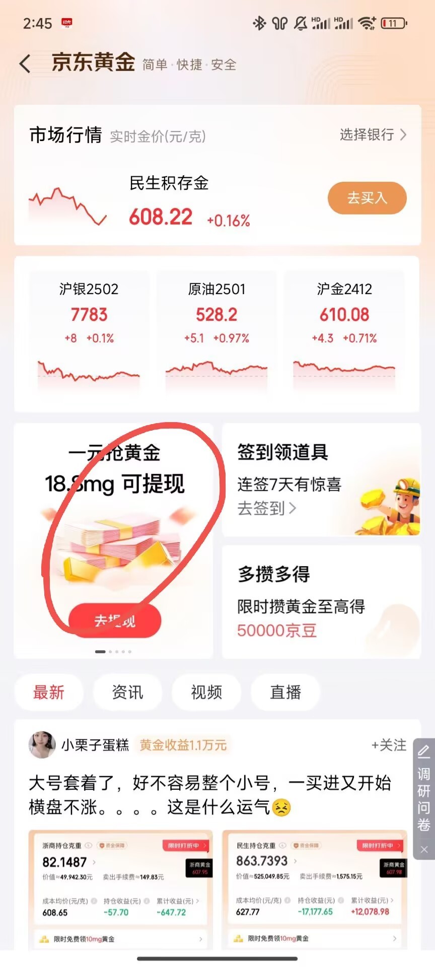 京东金融app,搜黄金,看图进去1买11,可以直接卖出体现润10+会弹出翻倍任务,可以选择1g进出,润20+,大号没有就换小号