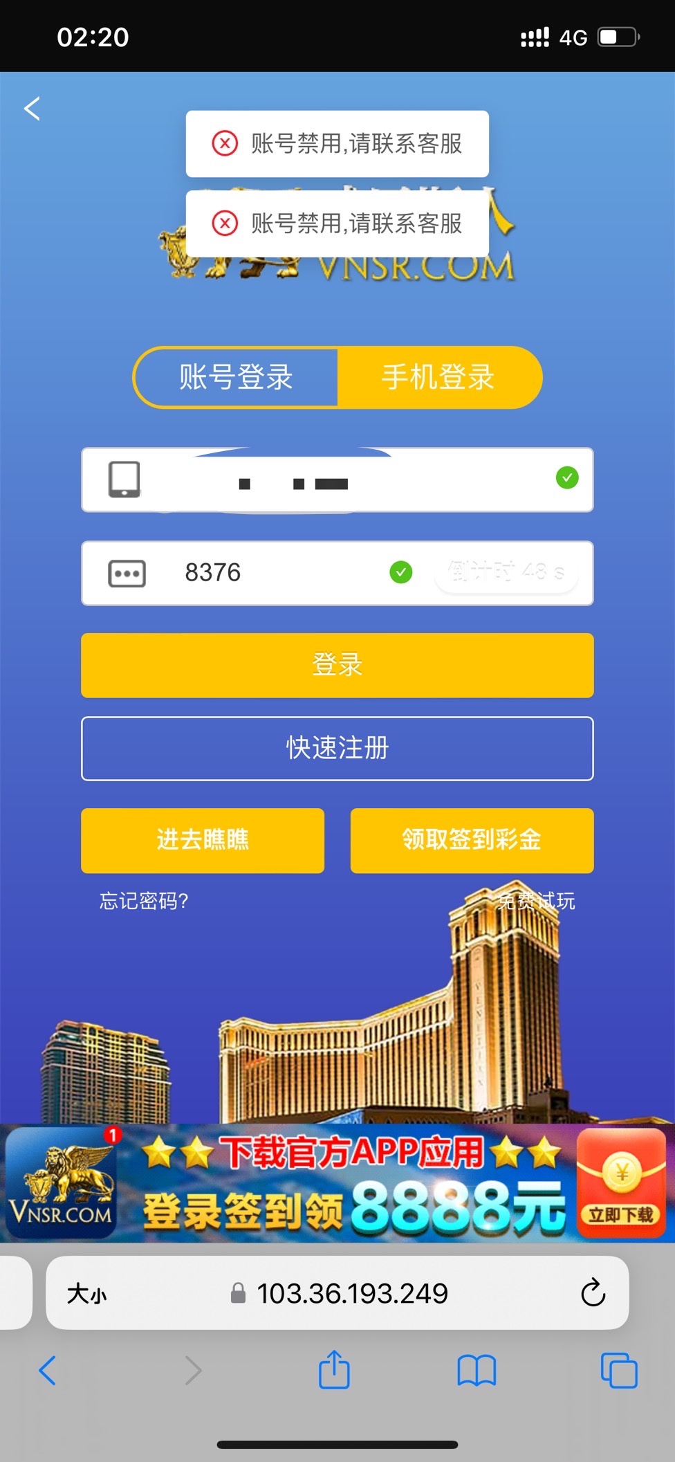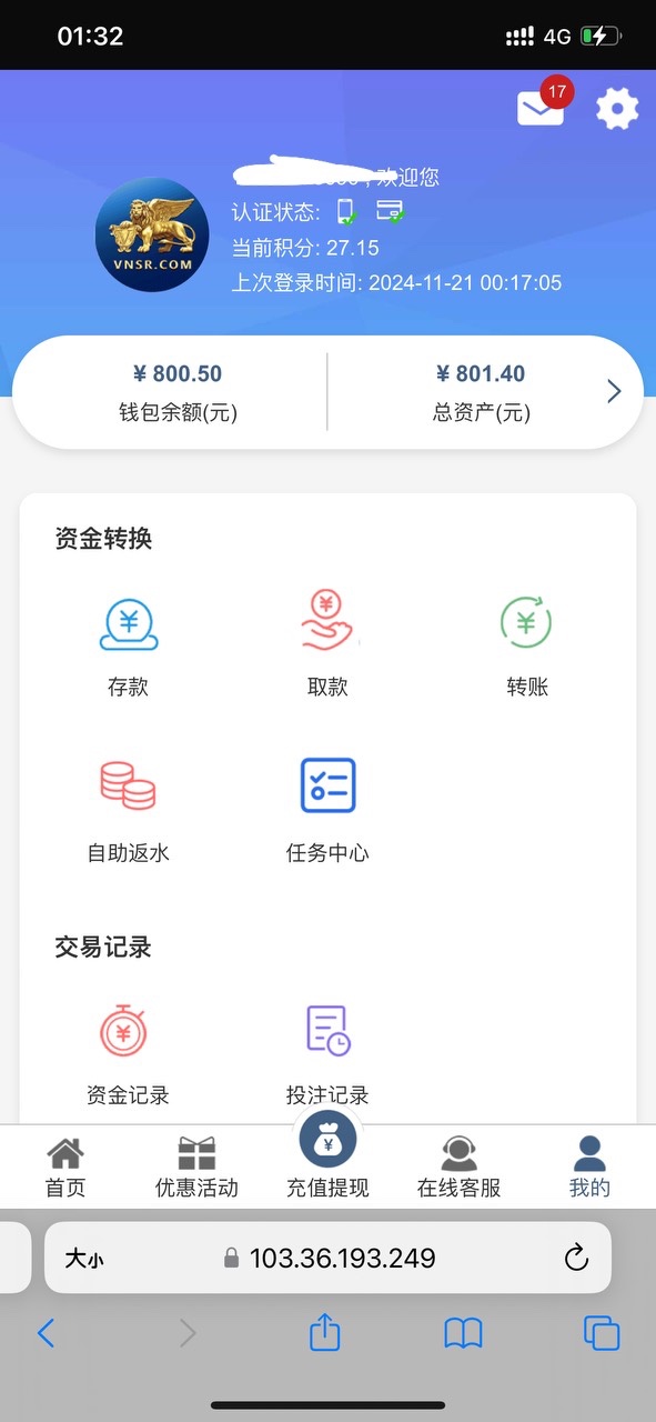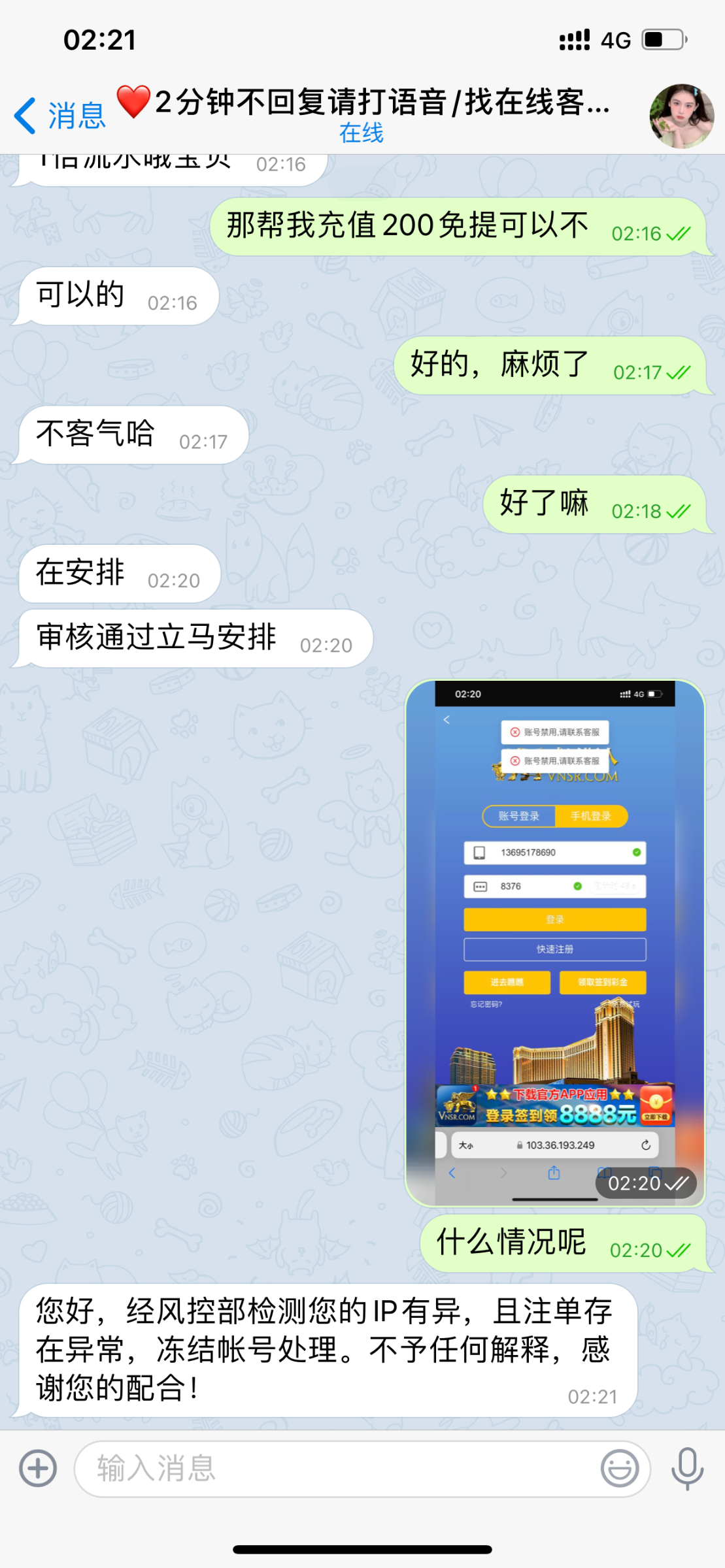 这个逼台天天打电话给我存送,我充了两三百进去,一点碧水没,没提过,然后昨晚充了100,领取了38的回归彩金,打pp一会上了1k,提款封号,这个台打电话很频繁的,望老哥注意不要去送人头了
