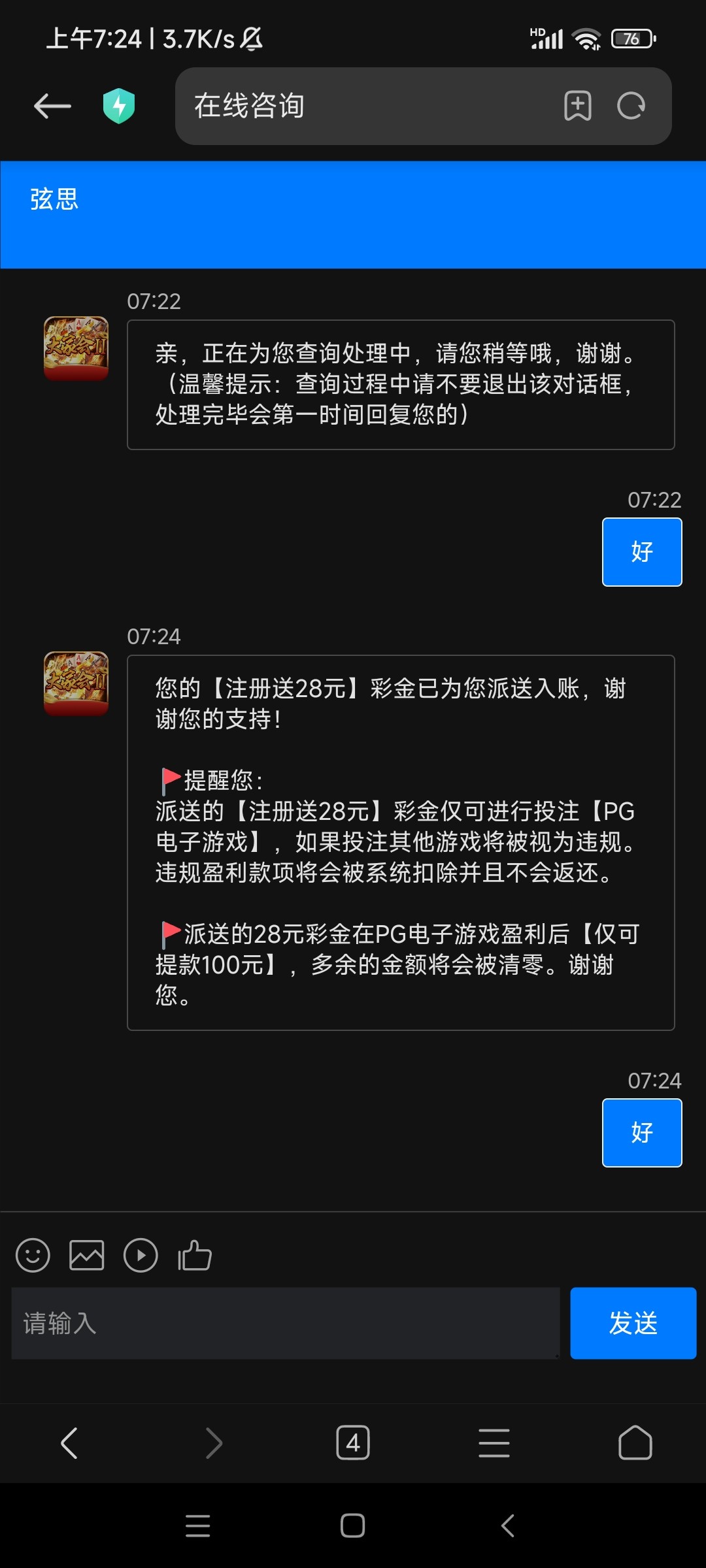 尊敬的 至尊 VIP玩家您好: ❤️❤️❤️❤️ 由于线上咨询会员较多,客服正在陆续加急处理中,还请您耐心等待,为您带来不便还请您谅解~!❤️❤️❤️❤️您好,工作人员正在忙,请稍等。