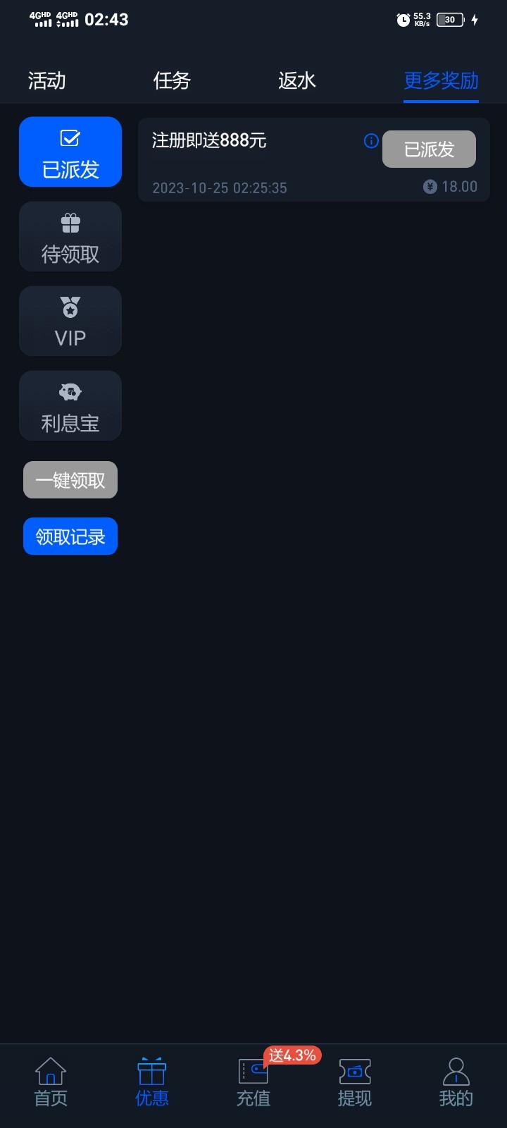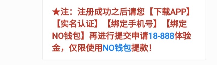 新用户注册完善资料活动里自助申请18,秒拒就找客服申请,无游戏限制,最低200提现。只能提NO钱包,提现被退回需要手持和电话核实。