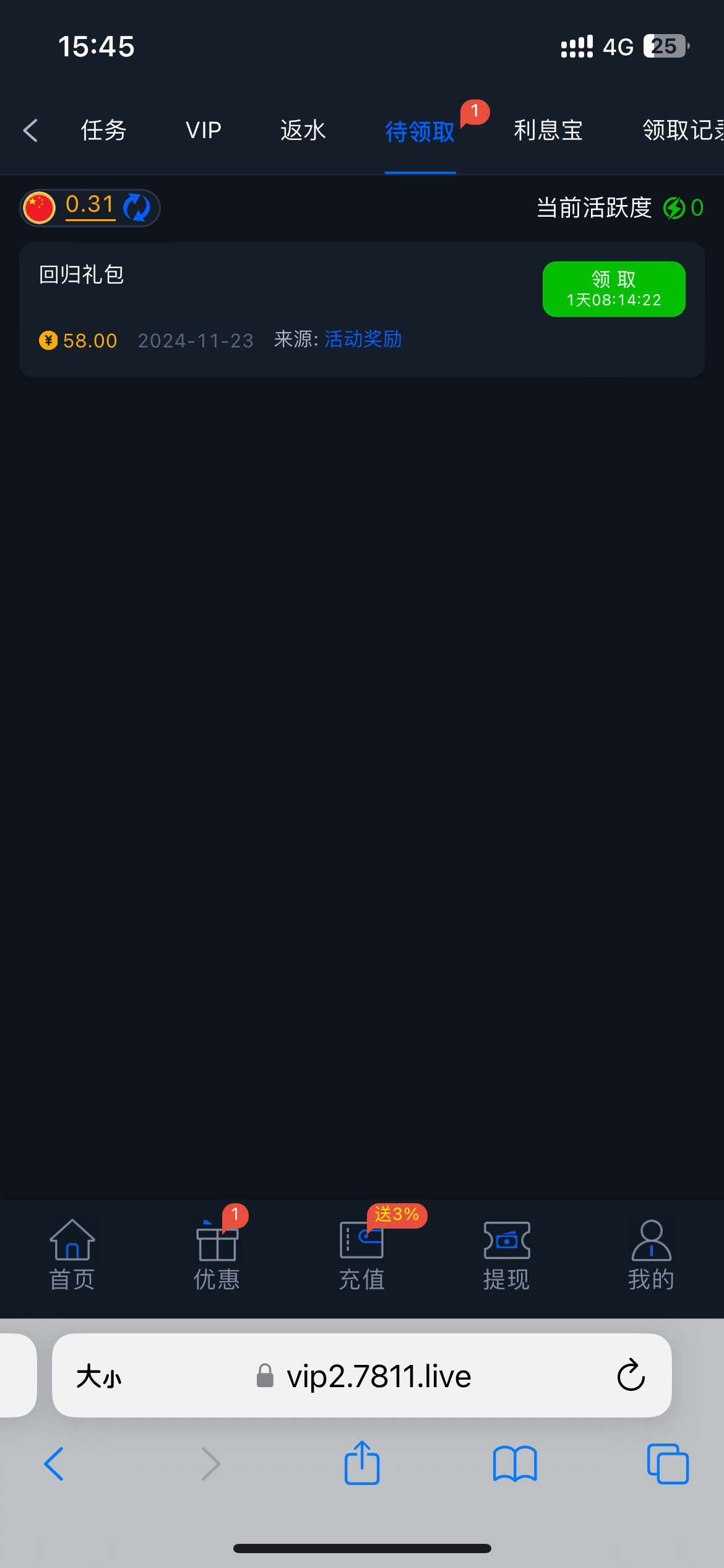您好,经查询您账号长期未充值。暂时不支持参与各种优惠活动,请您充值100元联系客服领取回归彩金哦亲
