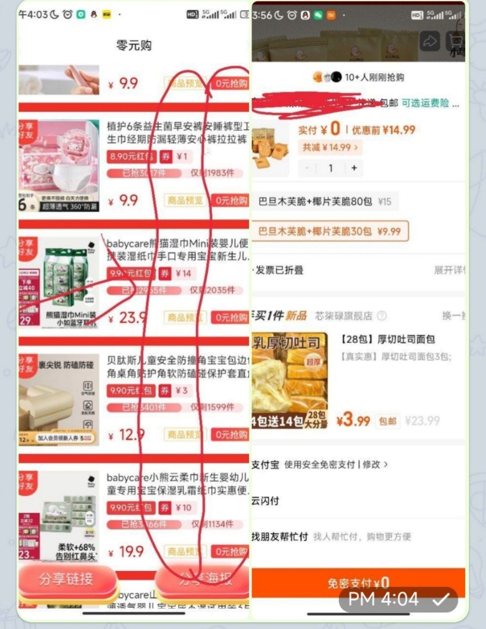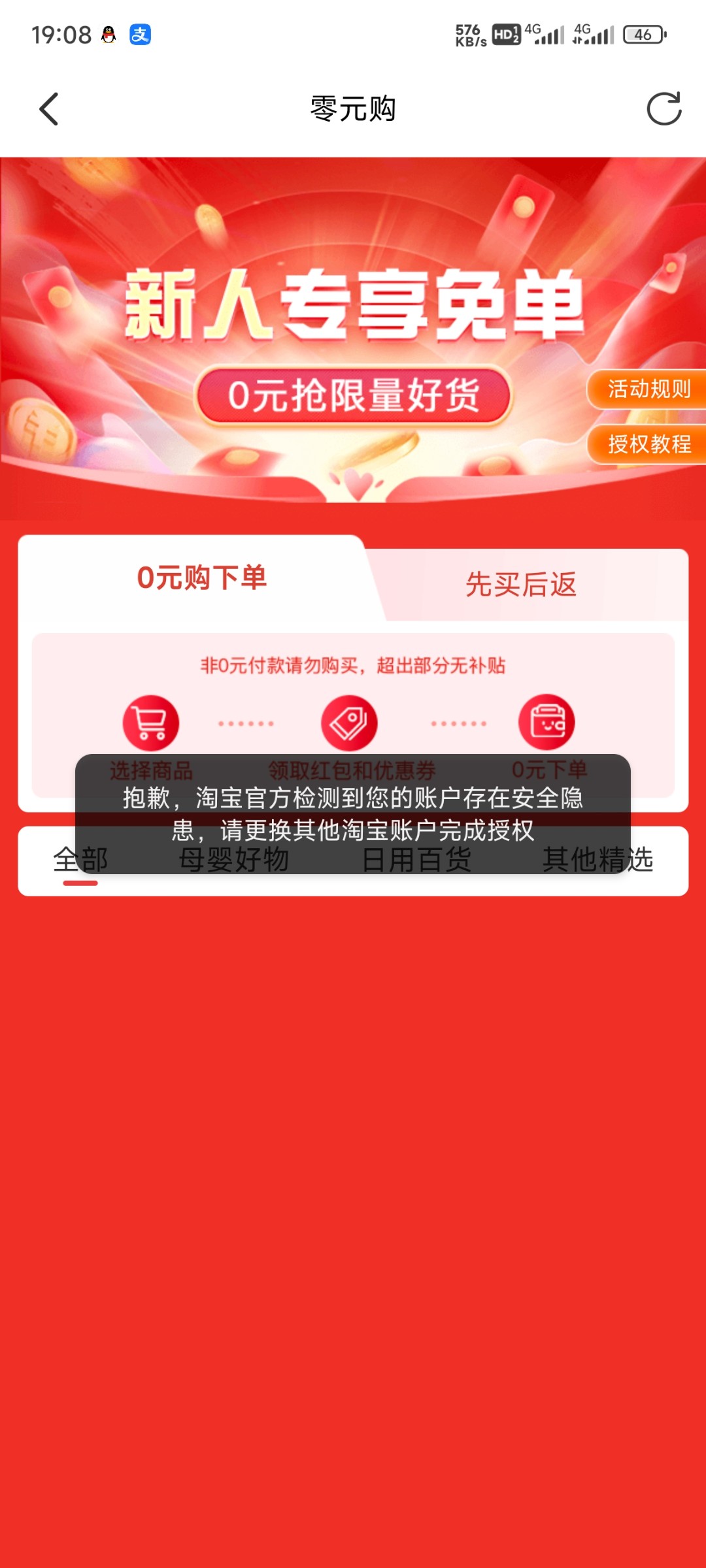进去之后点主页零元扣然后授权一下淘宝,那个可以浏览,自己看好商品,再点零元购只有一次机会的,需要什么自己看好再点,看图吧
