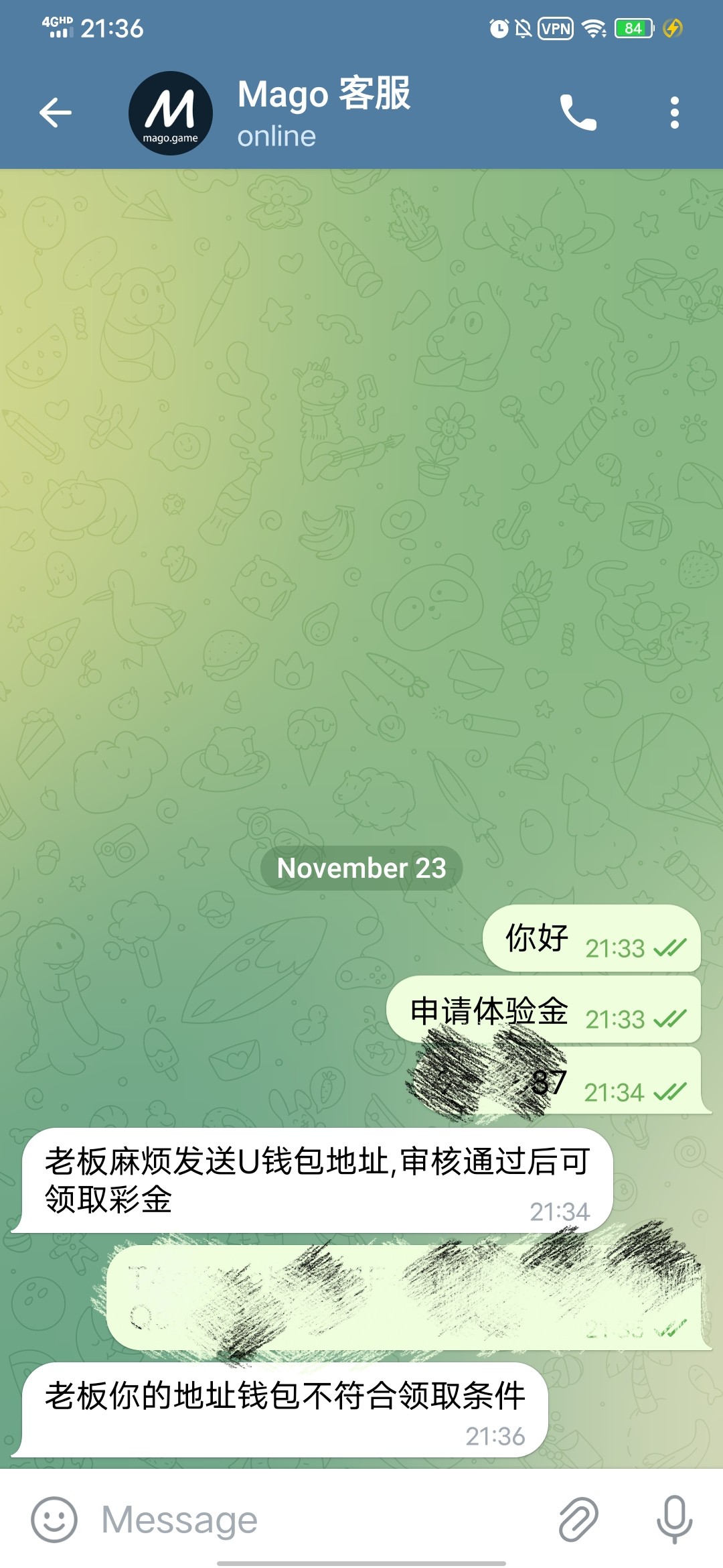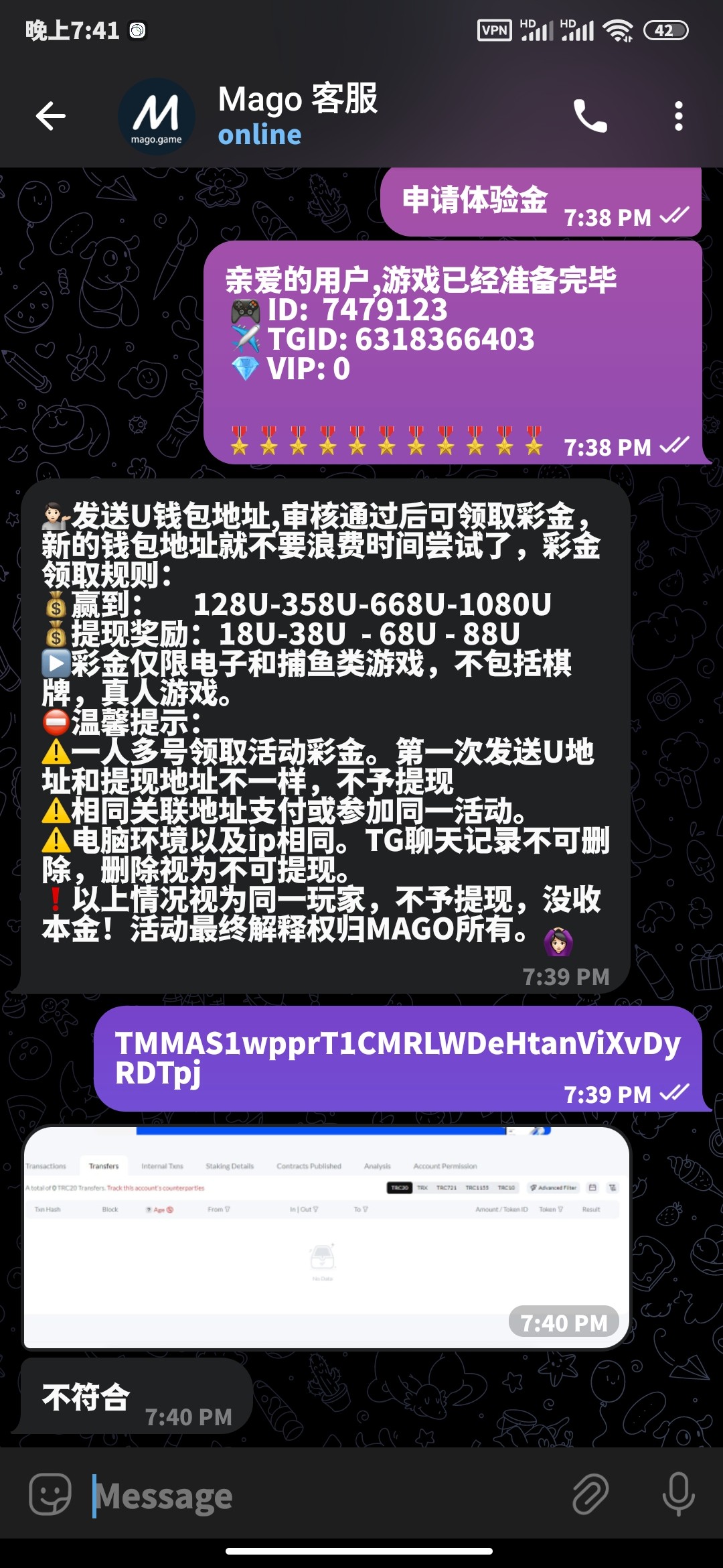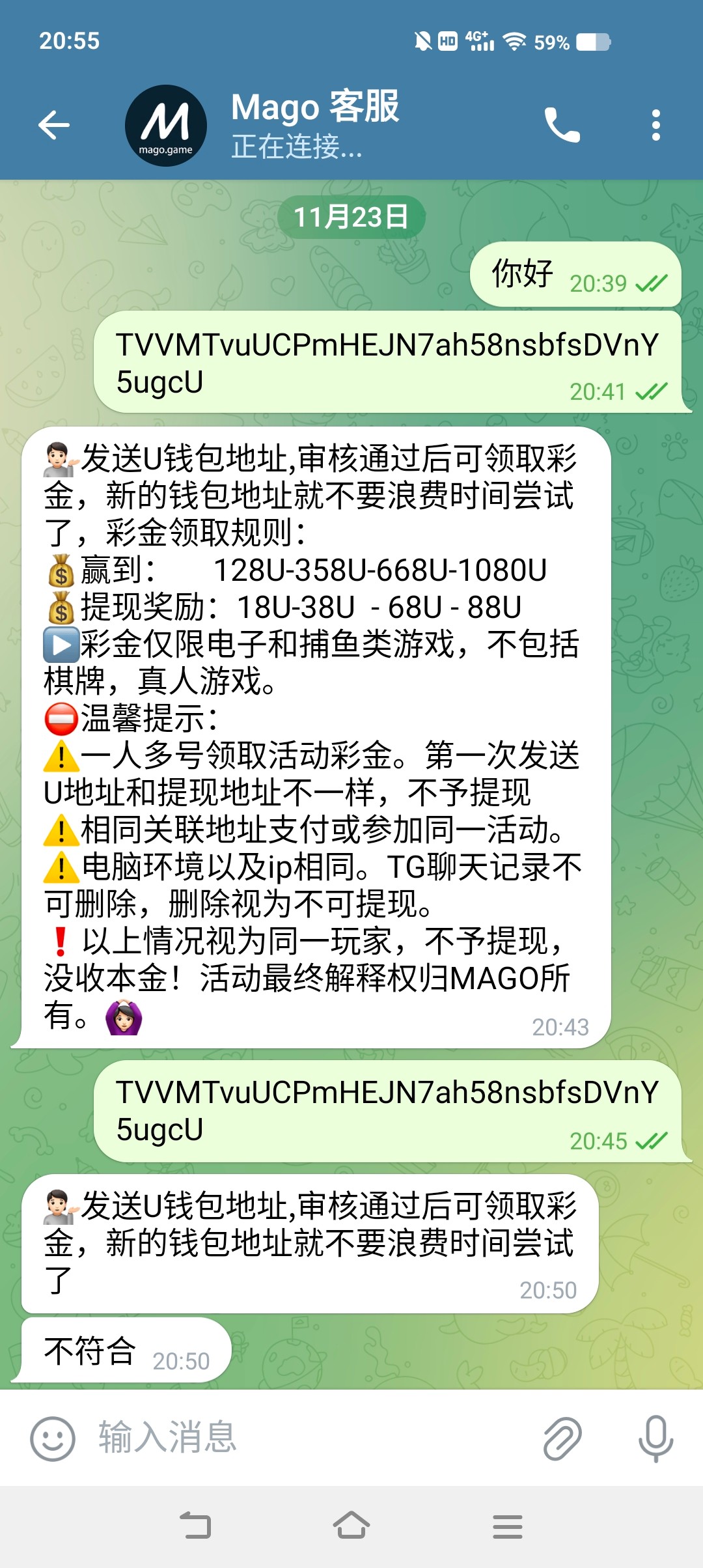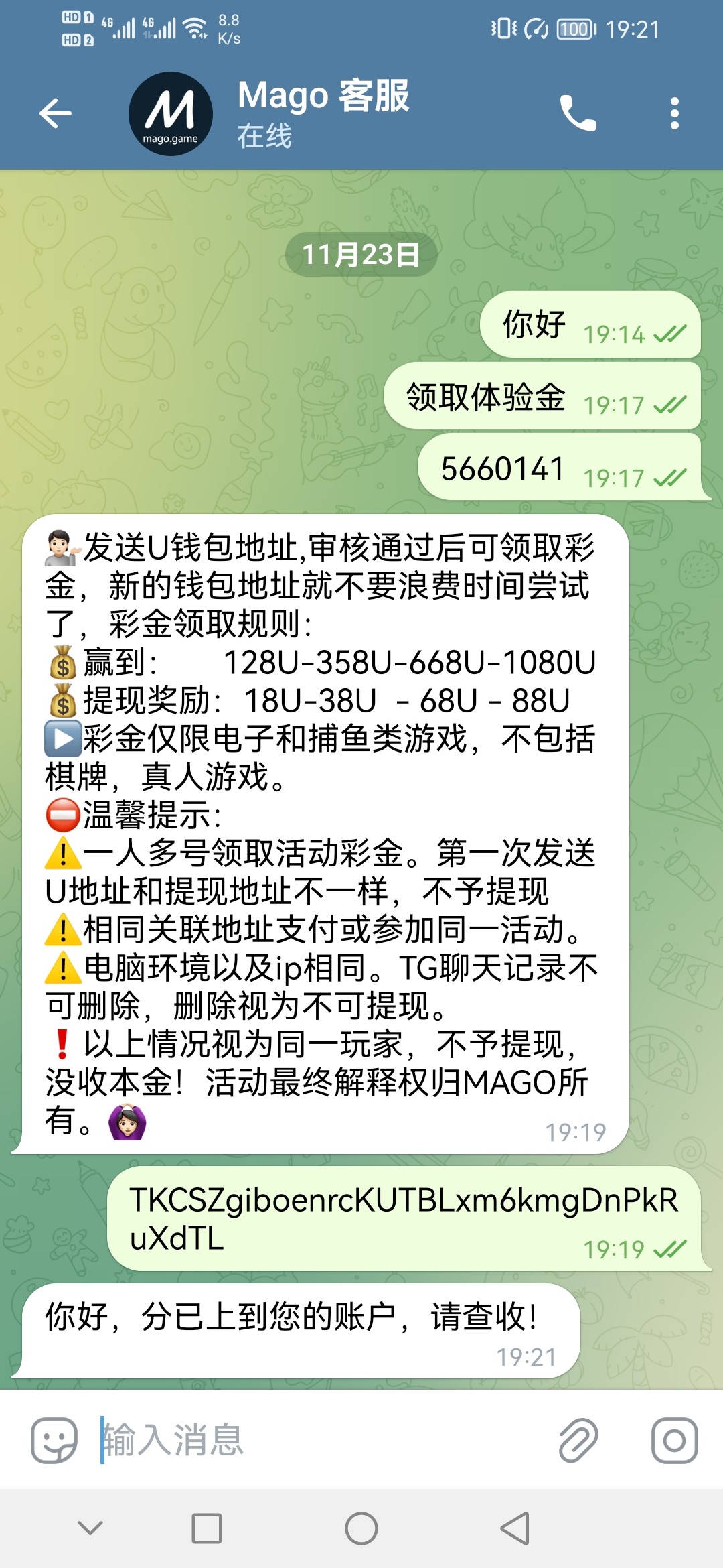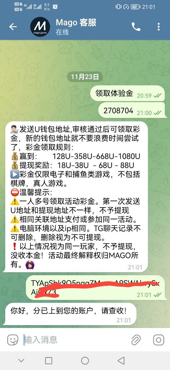 mago 送8u机器人: @MagoGamebot客服: @Mago_chat机器人那里进入游戏绑定u地址 发id和绑定的u地址给客服申请 打到128u提18u 只能打电子和捕鱼! 我用的欧易地址送了