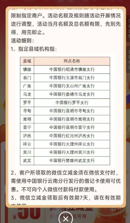 必须中行没有开通手机银行的或者开过已经注销了的,中行河南公众号-金管家-更多,开三类,必须开下图这几个云南网点,然后用开通的三类注册中行app,看图领取然后微信绑卡这张三类卡提现几块钱进去,领了立减金商家码套