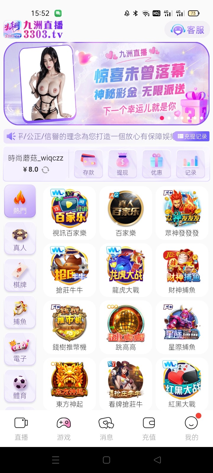 这个平台千万别充值 ,送8提现一直审核中 ,只要去找客服马上就封号