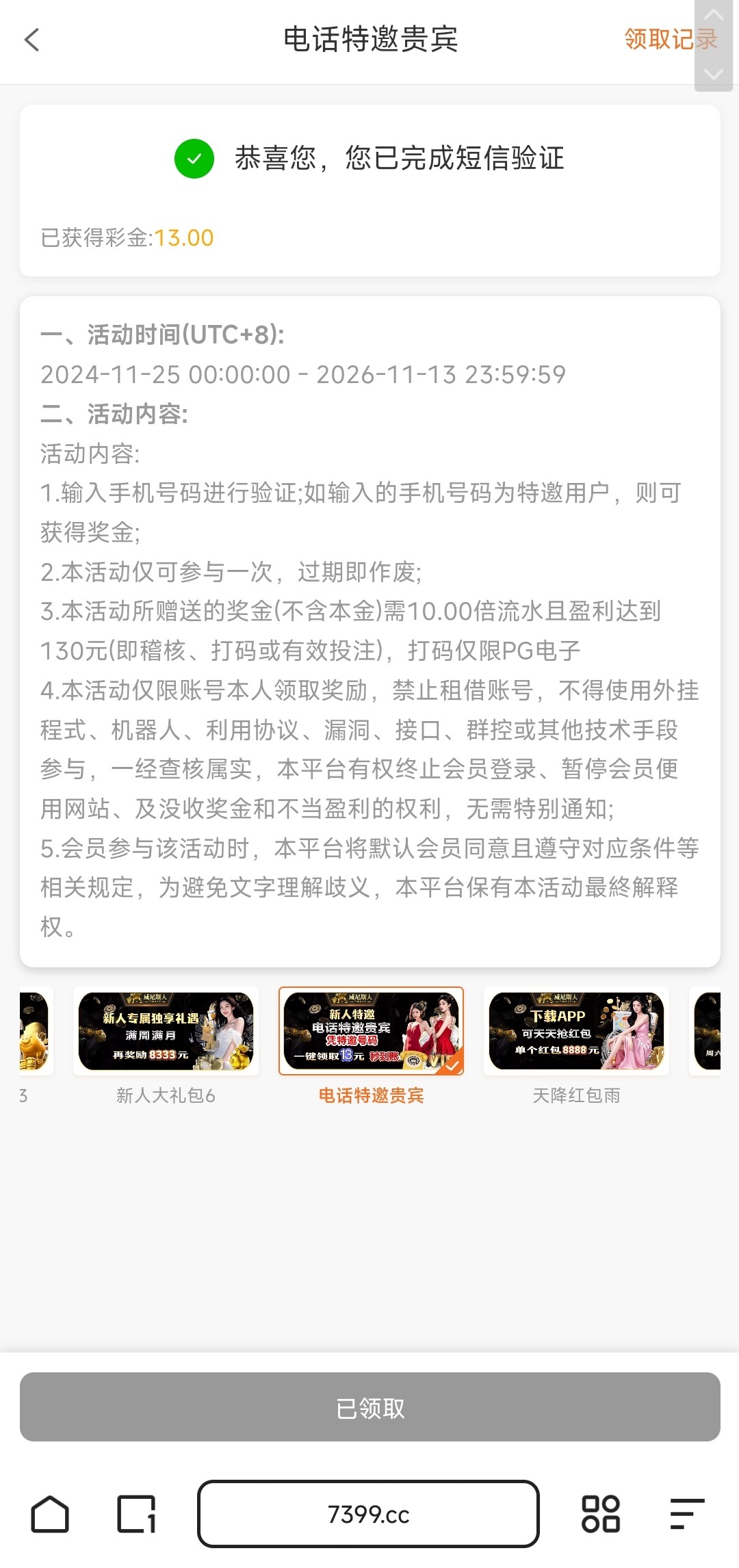 网址 7399.cc,我两个手机号都是领到了,打出来一个,你们试试