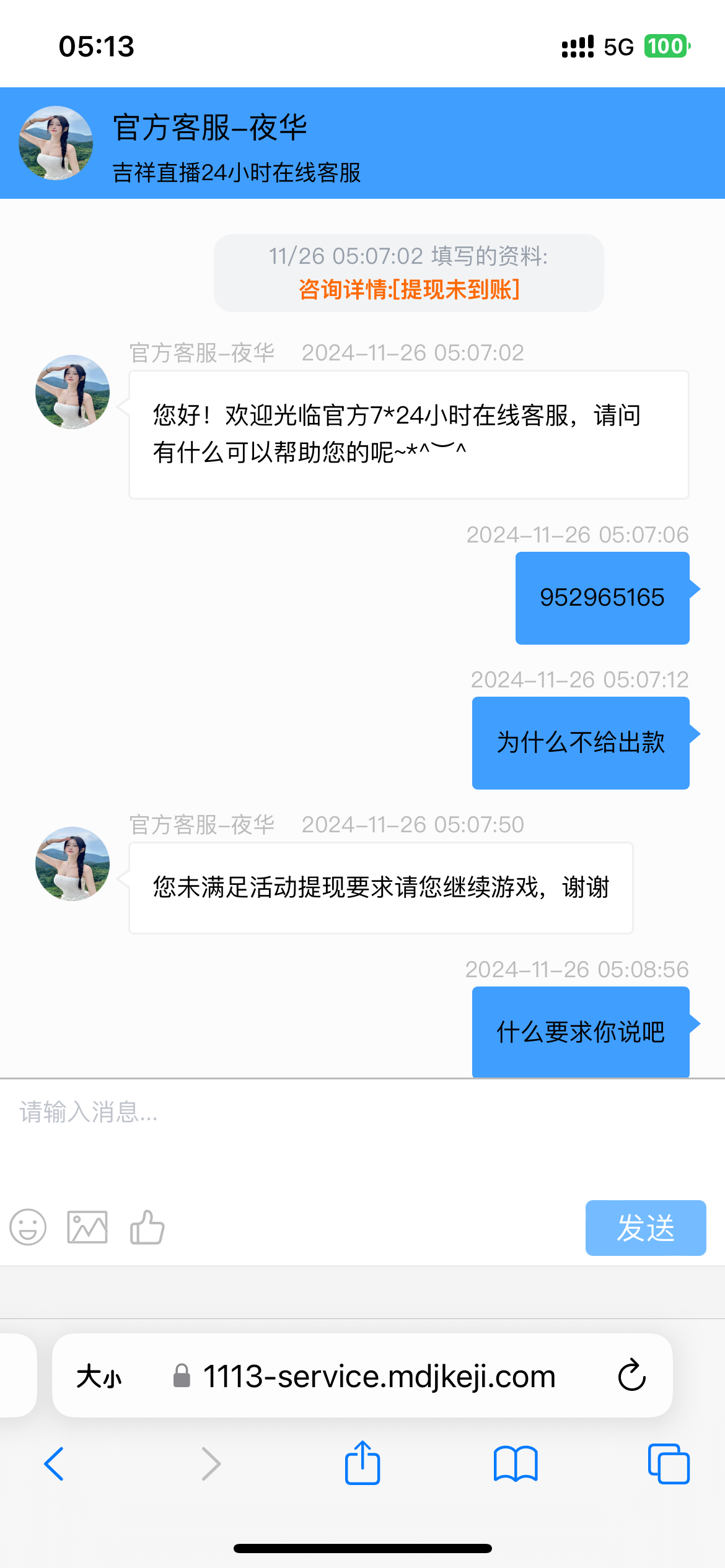 dy0760 ▶ 王铝铝 我300让充100,我没充买免费藏分,然后输光再充10块钱,然后爆了一个提现400失败,提示有未结注单,让继续玩游戏。一直玩一直提,出款就提示让玩游戏。提了几次,输到100出了。。。 2024-11-26