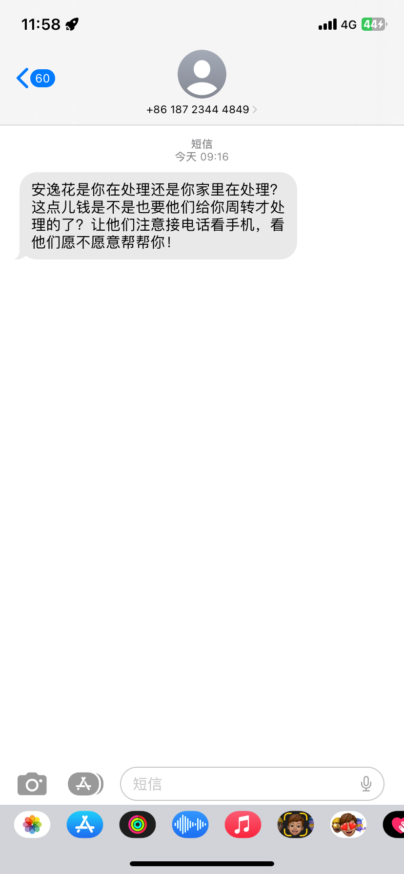 跟我也是这样发短信的 ,天天打电话过来 ,说在我们镇上把事儿办完去我家里面 ,这都快半个多月了还没去