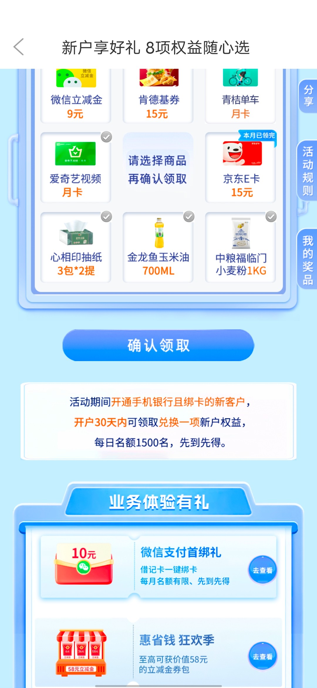 教大家领取爱奇艺月卡或者微信9元立减金,下载微商银行注册绑一张一类卡,然后开一张微商银行二类卡,然后首页找到手机银行新用户享好礼,点进去选择你想要的东西领取就好,限制没有开过微商银行的,然后微商银行卡绑定微信还有10元立减金,然后再主页搜索领奖中心,支付一分钱还能领取8元立减金,下载云闪付往微商银行二类里转两块钱,支付即可,限制新户