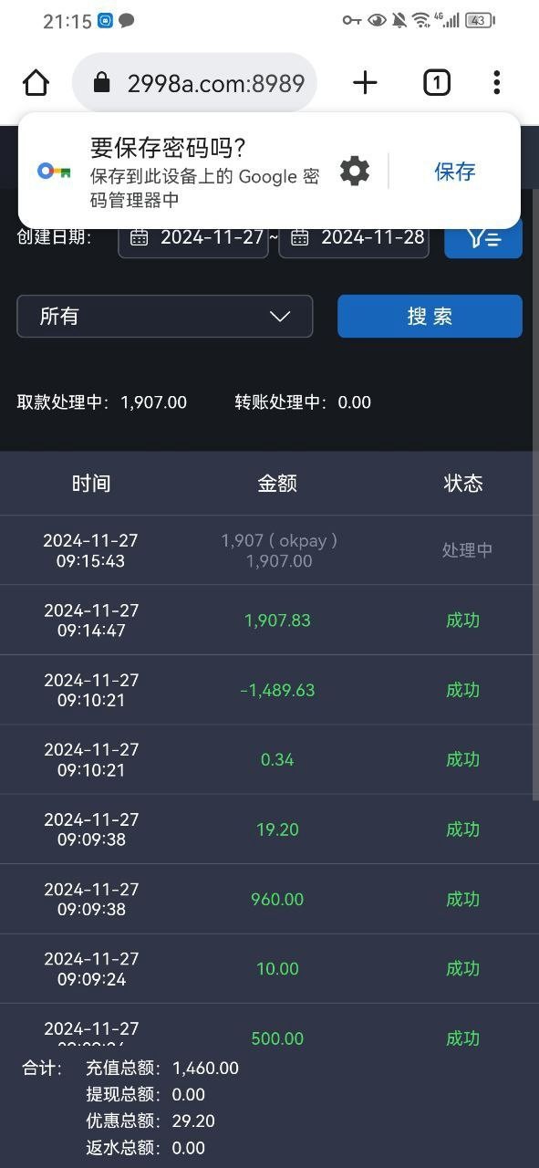 老哥网工具一体化 p1460下了1907,打了一倍流水就跑了,然后怕封钱包,先充值907去平台,卖币一千,平台907输了